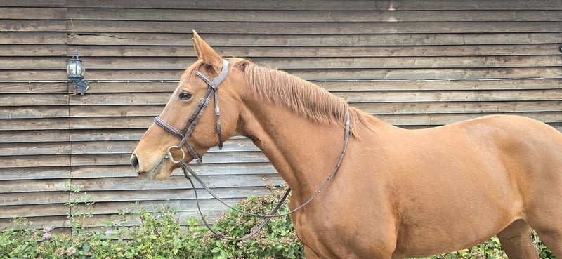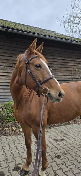 Cassy is a 10-year-old chestnut mare, standing at 16.1 hh. Her pedigree is unfortunately unknown. In recent years, she has been ridden mainly for leisure. However, it became clear that the mare needs consistent work with a rider who can handle her occasional testing behavior. In the field, she has some go but remains manageable. She has been in professional training for a few weeks, during which groundwork and jumping have been introduced. She shows a lot of enthusiasm and talent for these disciplines. Cassy is barefoot and in overall good health. No recent veterinary certificate is available. She has not yet been registered for competition. Location: 32425 Minden Videos available upon request via WhatsApp at 017670349915.