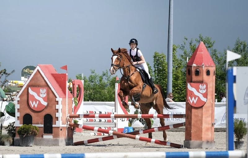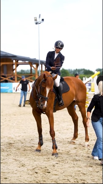 Chestnut mare from Greater Poland with a heart for show jumping. Perfect for riders beginning their competitive journey. At home, she was ridden by three young riders aged 15, 15, and 17. She is well-behaved with the farrier and veterinarian and is under the care of a physiotherapist. She is gentle in handling, does not bite or kick (she is a sweet mare). Quick, agile, and precise in the show jumping arena. Healthy and injury-free (TUV available for review from January 2024). She has been trained at home up to 120 cm. She has competed multiple times in the LL class, often placing in the ribbons, and has also participated in the L class. Due to her athletic pedigree, she would also be suitable for breeding. It is very important to me that she finds a loving home. Sale due to the desire to further develop her potential.