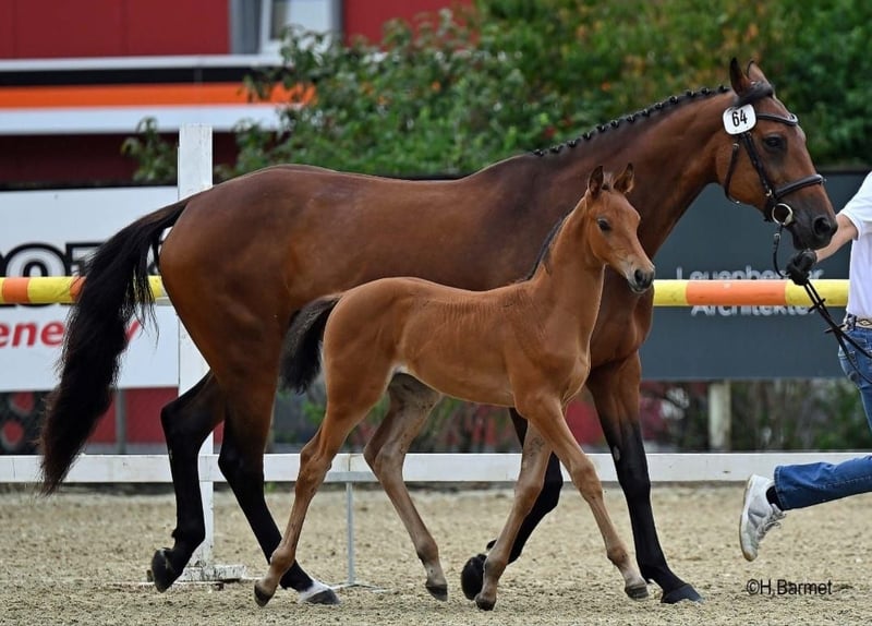 Imira boasts an excellent pedigree and has a wonderful temperament! She is registered up to 115 cm, although she could have competed higher, her health issues prevented this. In show jumping, Imira has always had a top attitude; she consistently jumps and fights her way through the course, never becoming nervous or difficult to handle, making her an ideal teacher and a pleasure to work with. Important: Her health problem is not hereditary; it was caused by human error. Additionally, she has never had any hoof issues. As a result, Imira is no longer rideable under saddle or only suitable for walk and trot; she also enjoys and handles ground work very well (Parelli). She is very straightforward and absolutely well-behaved in handling. She is completely sound and farrier-friendly. This year, she had her first foal, which she raised like a pro! Now I am looking for a place where she can continue to be a top-quality mother or serve as a companion horse!