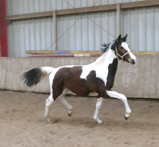 A very typy, pinto foal mare, Casey A, with a performance-oriented, international show jumping pedigree. On the sire's side, she descends from Cadiz (Cordess-Clinton x Heartbreaker x Shakespeare x Potsdam NRW), while on the dam's side, she is related through Zinedine (Guidam x Heartbreaker) and Ismo (Ilasso x First Gotthard x Zeus) – a proven international jumping lineage. The young mare exhibits strong, elastic movement and a lot of scope, making her well-suited for show jumping or eventing. In addition to her sporting potential, Casey A impresses with her balanced, people-oriented, and very pleasant temperament.