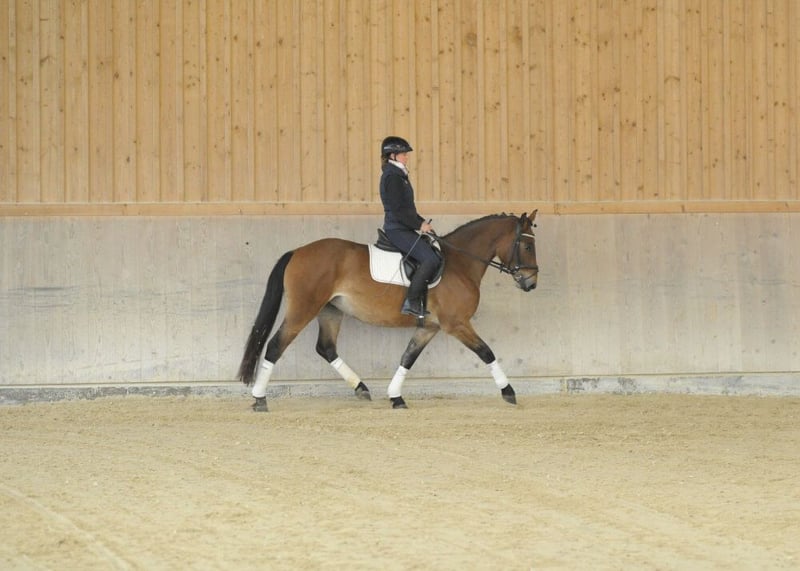 A very steady, friendly bay mare, easy to ride and uncomplicated in her overall demeanor. Experienced in the outdoor and not spooky. With a kind heart. A wonderful all-round mare for dressage, leisure riding, and trail riding.