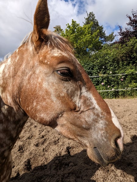 Flocke ist eine 4,5 jährige Stute mit einem Stockmaß von 150 cm. Sie lebt im Offenstall was wir uns auch weiterhin wünschen. Läuft barhuf und lässt sich überall anfassen. Tierarzt und Hufschmied sind auch kein Problem. Sie wurde bisher nur auf dem Platz gearbeitet, Gelände muss daher erst mit ihr geübt werden. Sie kennt Sattel und Reitergericht, das macht sie alles super brav mit. Sie braucht eine konsequente Hand, da sie ab und an auch testet ob du es auch ernst meinst. War bisher immer gesund. Ein Probereiten ist nur bedingt möglich, da wir nur einen kleinen Platz haben.