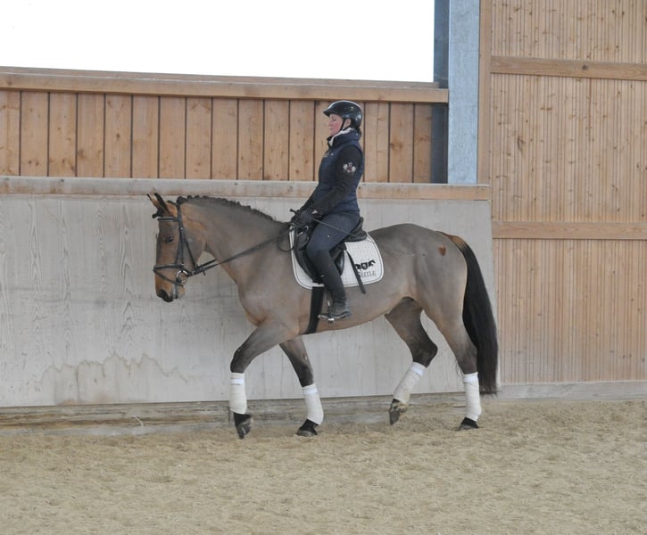 Kompakte, sehr sympathische braune Stute mit bester Allrounderqualität. Schon allein durch ihre liebenswerte und unkomplizierte Art, kann sie durch ihr Wesen punkten. Erst seit kurzem unter dem Sattel zeigt sie sich trotzdem ausgeglichen und nervenstark. Ihre Allrounder- und Reitqualitäten lassen ebenfalls keine Wünschen offen.