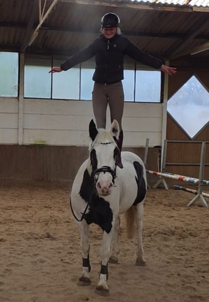 Schicke Partnerin für die ganze Familie! Paula hat ansprechende Bewegungen, lässt sich leicht an den Zügel stellen und ist angenehm fleißig. Auch am Sprung zeigt sie durchaus Talent. Besonders gern und zuverlässig geht sie ins Gelände. Mit ihr hat man einfach täglich Spaß. Paula kam zur weiteren Ausbildung zu uns und geht nebenbei auch schon im Unterricht mit. Selbst von Kindern lässt sie sich hier prima reiten und im Springunterricht lief sie auch schon mit. Aufgrund ihres kompakten Formats deckt sie aber auch größere Erwachsene gut ab. Bei weiterer Förderung wäre sie im Turniersport einsetzbar, aber auch als reines Freizeitpferd ist sie zufrieden. Im Umgang ist Paula ein Schatz. Verladen, Hufschmied, Duschen etc. alles kein Problem. Auch mit anderen Pferden verträgt sie sich gut. Bei uns steht sie nachts in der Box und tagsüber auf dem Paddock. Aber auch reine Weidehaltung und Offenstall kennt sie. 8j St., 1.55m Klinische Aku vorhanden Video: https://youtu.be/u5B7R9OswLQ?si=vq7M2fg4WOAEY9v9 Noch mehr Fotos, Videos und kleine Einblicke in den Alltag unserer Pferde gibt’s auf Instagram: [maresi_lange]. Schauen Sie gern vorbei und lernen Sie unsere Vierbeiner schon vorab ein bisschen kennen. You can find more photos, videos and little insights into the everyday life of our horses on Instagram: [maresi_lange]. Feel free to take a look and get to know our horses a bit better in advance.“ Weitere Pferde auf meiner Homepage MaresiLange.de oder auf Anfrage. Die Beschreibung des Pferdes beruht auf subjektiven Eindrücken und Erfahrungen unsererseits und ist keine Beschaffenheitsvereinbarung und Zusicherung von Eigenschaften. Probereiten erfolgt auf eigene Gefahr. Verkauf erfolgt im Auftrag. Für das Vorstellen/ Probereiten des Pferdes erlauben wir uns eine Aufwandsentschädigung in Höhe von 30 Euro zu berechnen. Diese wird natürlich bei Kauf des Pferdes verrechnet.