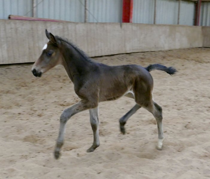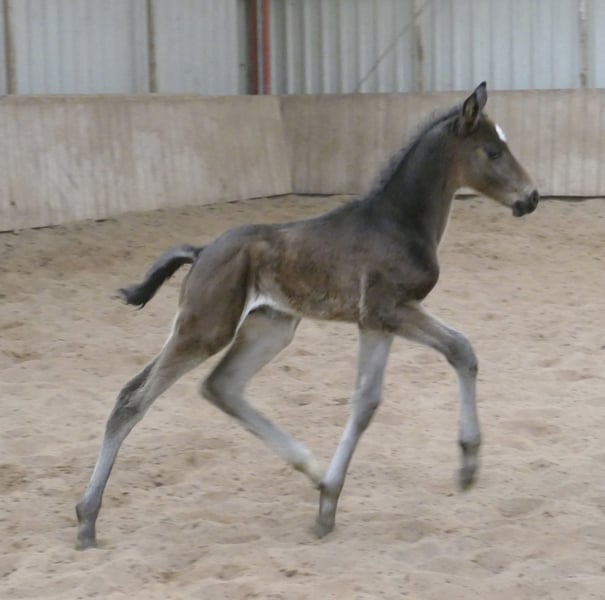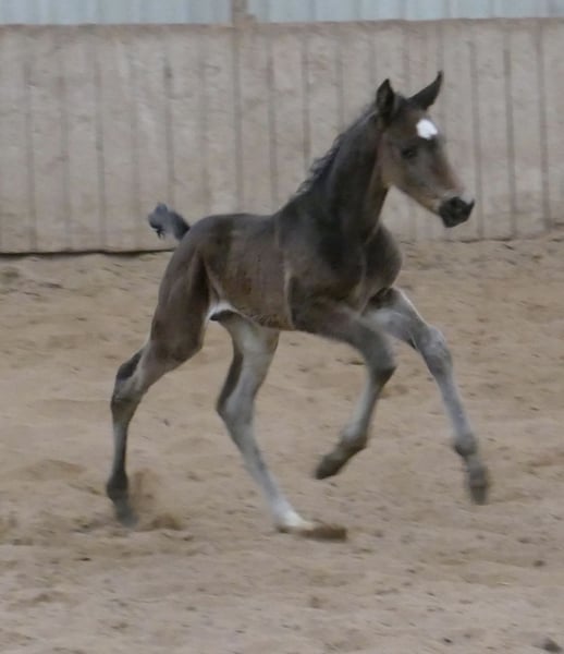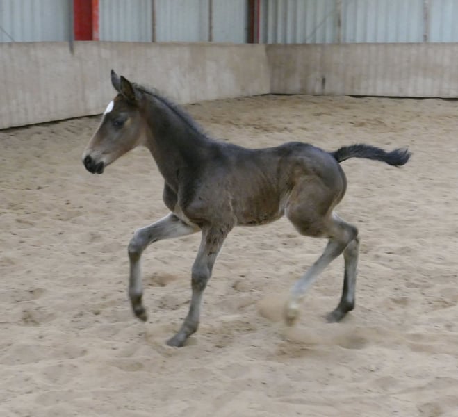Corvin A – schwarzbraunes Hengstfohlen mit hochkarätiger internationaler Springabstammung. Ausgestattet mit drei sehr guten Grundgangarten, viel Elastizität und auffallender Bewegungsqualität präsentiert sich Corvin A als hochmoderne Nachwuchshoffnung für den Spring- und Vielseitigkeitssport. Sein Pedigree vereint bewährte Leistungsblutlinien: Väterlicherseits führt er über Cadiz (Cordess–Clinton) wertvolles Clinton- und Heartbreaker-Blut, kombiniert mit Shakespeare und Potsdam NRW. Die Mutterlinie bringt über Chaman (Baloubet du Rouet x I Love You) sowie Ismo (Ilasso x First Gotthard x Zeus) weitere international erfolgreiche Springgene ein. Ein sehr modernes, langbeiniges Hengstfohlen mit viel Übersicht, Kraft aus der Hinterhand und sportlichem Auftreten – hochinteressant für ambitionierte Reiter und den gehobenen Sport. Corvin A von Cadiz (Cordess-Clinton x Heartbreaker x Shakespeare x Potsdam NRW) x Chaman (Baloubet du Rouet x I Love You) x Ismo (Ilasso x First Gotthard x Zeus).