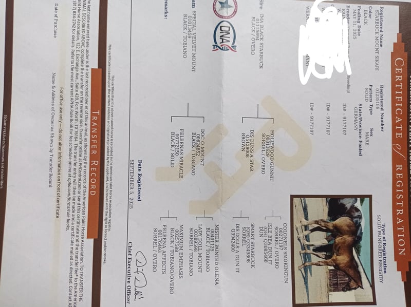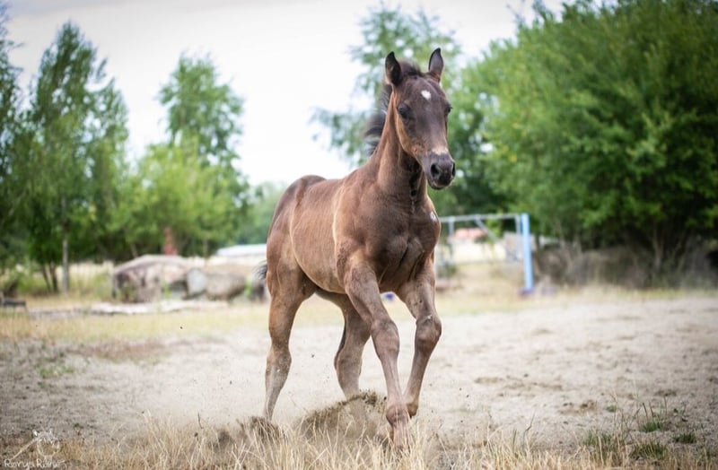 Bonjour, je suis la petite Sikari (en indien = Douce) et je suis une pouliche noire solide au caractère bien trempé. Je suis née en mai 2025 et je cherche un propriétaire aimant et cohérent après le sevrage en décembre. Mon papa est Black Starbuck, un étalon Quarter de 154 cm avec une excellente lignée (Hollywood Dun It, Colonels Smoking Gun, Katie Gun ...). Ma maman est Special Velvet Mount, jument primée (1,46). Ma maman est 6Panel n/n. Depuis mon premier jour, je suis une vraie espiègle qui adore câliner et découvrir tout ce qui m'entoure. Quand je serai grande, je mesurerai environ 1,50 m. Déjà maintenant, je suis une pouliche très robuste et musclée. Je fais face avec courage à tout ce qui est nouveau et je sais aussi assez bien ce que je veux. J'ai hérité cela de ma maman :) Je grandis dans un troupeau mixte en mode paddock trail. Cela me permet de courir, jouer et manger comme je le souhaite. J'espère que cela restera pareil chez mon nouveau propriétaire. Je ne veux pas être dans un box, même la nuit. Avant le sevrage, Sikari sera régulièrement vermifugée, présentée au maréchal-ferrant et apprendra l'ABC des poulains. Nous attachons une grande importance à ce que nos poulains soient bien éduqués et amicaux. Sikari recevra également un passeport équin du PHCG et des papiers APHA. Si Sikari a éveillé votre intérêt, n'hésitez pas à nous écrire pour plus d'infos. Nos poulains ne sont confiés qu'à des conditions de vie adaptées (stall ouvert/stall actif/paddock trail, etc.) et à des mains aimantes, prêtes à offrir à leur petit trésor une croissance et une vie avec un accès libre. Comme nos poulains peuvent participer à la décision de qui sera leur partenaire, une rencontre préalable est indispensable. Le prix est valable jusqu'en novembre 2025. www.harzhof-minsleben.de