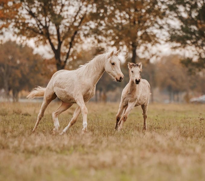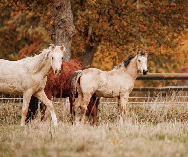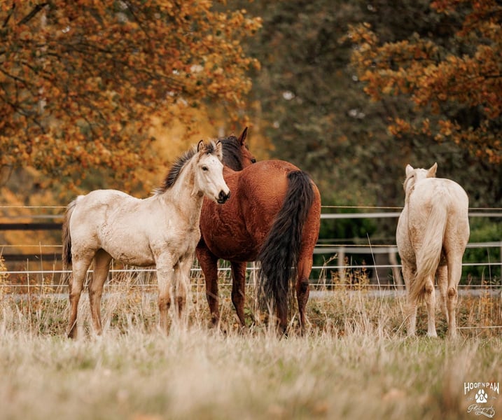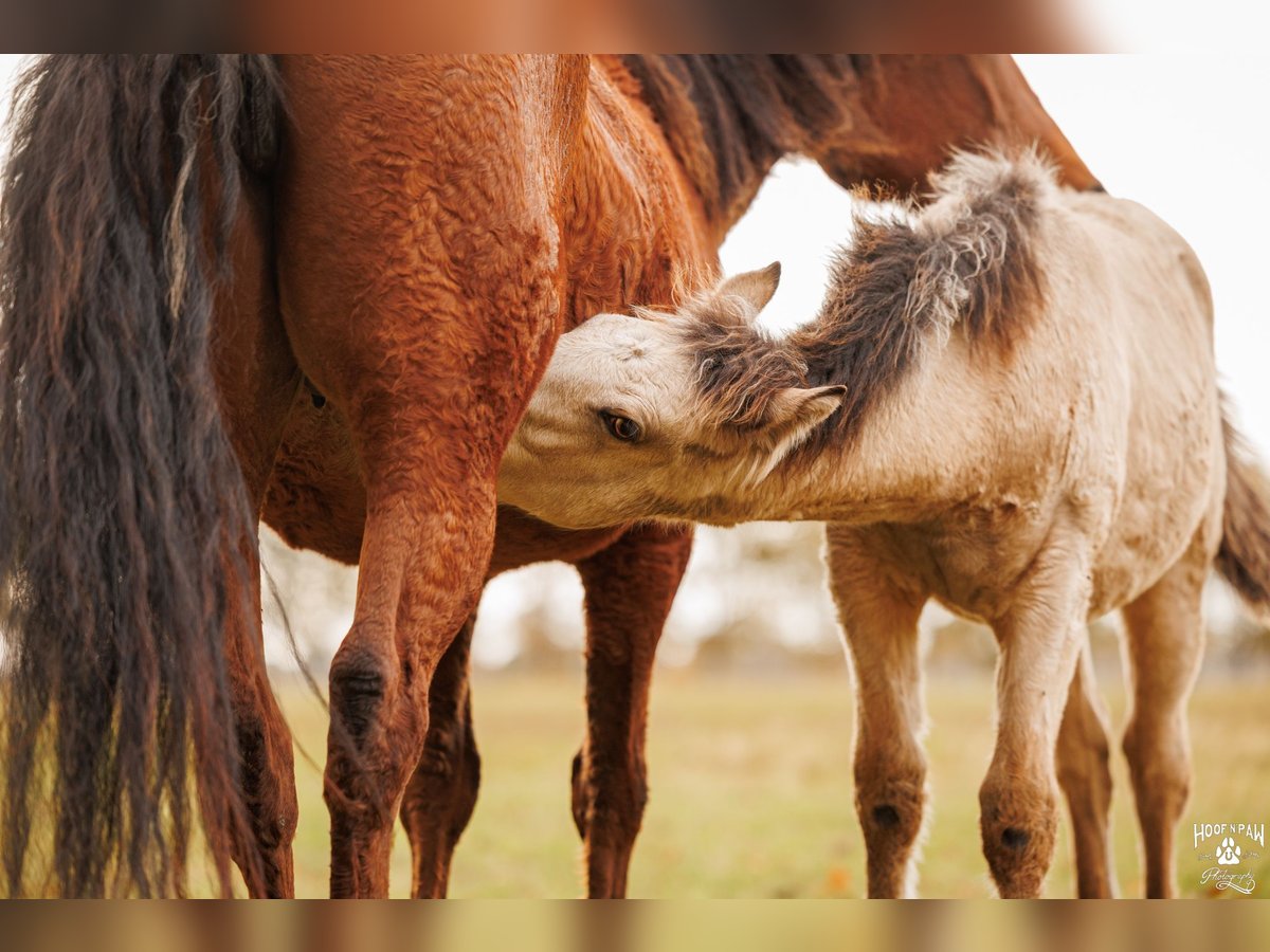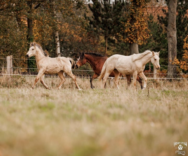 This strikingly beautiful Buckskin filly, born in June 2025, is the little sister of our exceptional Palomino mare and matches her in expression, presence, and movement strength. She impresses with her strong charisma, a bright, alert mind, and a very harmonious overall appearance – a confident little mare with plenty of charm. In movement, she demonstrates rhythm, impulsion, and correctness. Her gait is harmonious and well-balanced, which has been recognized and awarded by the breeding association. Due to her pedigree and the presence of the cream gene, she is registered as a Palomino. Her temperament is particularly noteworthy: attentive, brave, and cooperative, with quick comprehension and a positive work attitude. She approaches new situations with curiosity, remaining clear-headed and manageable – qualities that make her a pleasant and reliable partner under saddle. She comes from a proven bloodline: her dam is a Curly Horse mare, known for stress resistance and eagerness to learn. Her sire, Sölrings Cuvée, an approved performance stallion and breed champion, brings type, harmony, good basic gaits, and a balanced temperament – qualities he consistently passes on to his offspring. With an estimated final height of approximately 16.1 hands, she offers excellent potential for versatile use. She is suitable for breeding, ambitious leisure riders, or as a dependable family horse. We can also very well imagine her as a future therapy horse. She has been raised in a herd with her mother, relatives, and other young horses, developing secure social behavior early on. She moves confidently within the group, communicates respectfully and clearly – an important foundation for mental stability. In daily handling, she is people-oriented, straightforward, and eager to learn. She enjoys participating in everything, seeks contact, and wants to please people. This combination of character strength, inner calm, and motivation promises very pleasant riding qualities. This Buckskin mare combines correct movement, breeding quality, and a strong temperament. A harmonious young horse with potential for those who value character and a fair, thoughtful partner.