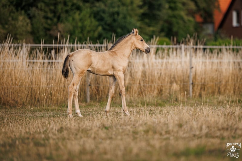 Diese auffallend schöne Buckskin-Jungstute, geboren im Juni 2025, überzeugt durch ihre starke Ausstrahlung, einen wachen, klaren Kopf und ein sehr harmonisches Gesamtbild. Eine selbstbewusste junge Stute mit viel Charme, die sowohl für Freizeit, Familie, Zucht oder auch therapeutische Arbeit großes Potenzial mitbringt. Bereits als Saugfohlen wurde sie prämiert – sowohl ihr Typ, ihr korrekter Körperbau als auch ihr Gangwerk beeindruckten den Zuchtverband und bestätigen sie als besonders vielversprechendes Nachwuchspferd. Durch das von ihr getragene Creme-Gen besitzt sie Palomino-Papiere. In der Bewegung zeigt sie sich leichtfüßig und schwungvoll mit taktsicheren, harmonischen Grundgangarten. Ihre Bewegungen wirken fließend und elastisch – Eigenschaften, die sowohl Züchter als auch ambitionierte Freizeitreiter ansprechen. Besonders hervorzuheben ist ihr Interieur: Sie zeigt sich aufmerksam, lernwillig, kooperationsbereit und sehr klar im Kopf. Neue Situationen begegnet sie interessiert und neugierig, bleibt dabei ausgeglichen und menschenbezogen. Diese Eigenschaften lassen auf ein angenehmes, verlässliches Reitpferd schließen. Sie entstammt einer bewährten Zuchtlinie: Ihre Mutter ist eine Curly Horse Stute, die insbesondere Stressresistenz, Sensibilität und Lernbereitschaft weitergibt. Der Vater Sölrings Cuvée, gekörter Leistungshengst und Rassesieger, überzeugt mit Typ, Harmonie, korrekten Grundgangarten und einem ausgeglichenen Interieur – Qualitäten, die er zuverlässig an seine Nachkommen vererbt. Mit einem erwarteten Endmaß von ca. 157 cm bringt sie beste Voraussetzungen für vielseitige Einsatzmöglichkeiten mit – ob für ambitionierte Freizeit, Familie, Zucht oder auch im therapeutischen Bereich. Sie wächst im Herdenverband mit Mutter, Verwandtschaft und anderen Jungpferden auf und entwickelt dadurch ein sicheres und respektvolles Sozialverhalten. In der Gruppe bewegt sie sich souverän, kommuniziert klar und sucht zugleich gerne den Kontakt zum Menschen. Diese besondere Buckskin-Stute vereint Typ, korrekte Bewegung und ein außergewöhnlich gutes Interieur. Ein harmonisches Nachwuchspferd mit Charakter, Herz und vielseitigem Potenzial – für Menschen, die Wert auf Gelassenheit, Qualität und ein partnerschaftliches Pferd legen.