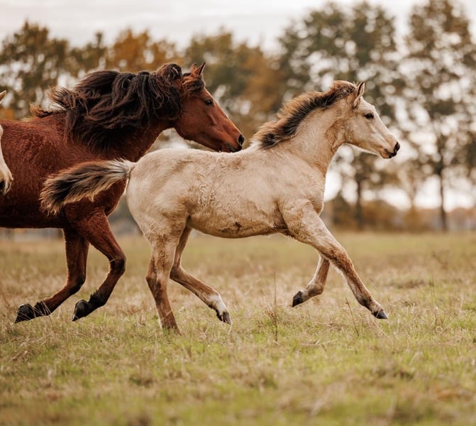 Cette jeune jument buckskin, née en juin 2025, attire immédiatement l’attention par sa beauté. Elle est la petite sœur de notre exceptionnelle jument palomino et ne lui cède en rien en expression, présence et puissance de mouvement. Elle séduit par son charisme, son esprit vif et clair, ainsi que par son allure très harmonieuse – une petite fille confiante, pleine de charme. Dans ses allures, elle se montre régulière, dynamique et correcte. Son mouvement est harmonieux et bien équilibré, ce qui a été reconnu et récompensé par l’association de race. Grâce à ses origines et à la présence du gène crème, elle possède un pedigree palomino. Son tempérament est particulièrement remarquable : attentive, courageuse et coopérative, dotée d’une grande rapidité d’apprentissage et d’une attitude positive envers le travail. Elle accueille avec intérêt les nouvelles situations, restant toujours lucide et maîtrisée – des qualités qui en font une partenaire agréable et fiable pour le cavalier. Elle provient d’une lignée de race éprouvée : sa mère est une jument Curly Horse. Elle combine résistance au stress et grande capacité d’apprentissage. Son père, Sölrings Cuvée, étalon de performance agréé et vainqueur de race, apporte typicité, harmonie, bonnes allures de base et un tempérament équilibré – des qualités transmises à ses descendants. Avec une taille estimée d’environ 1,57 m, elle possède d’excellentes aptitudes pour une utilisation polyvalente. Elle est adaptée aussi bien pour la reproduction que pour des cavaliers de loisir ambitieux ou comme cheval de famille fiable. Nous pouvons également l’imaginer comme futur cheval thérapeutique. Elle a grandi en troupeau, avec sa mère, des proches et d’autres jeunes chevaux, et a rapidement développé un comportement social sûr. Elle se déplace avec assurance au sein du groupe, fait preuve de respect et de communication claire – des bases essentielles pour sa stabilité mentale. Au quotidien, elle se montre proche de l’homme, simple d’approche et désireuse d’apprendre. Elle aime participer, rechercher le contact et faire plaisir à son cavalier. Cette combinaison de caractère fort, de calme intérieur et de motivation laisse présager une montabilité très agréable. Cette lady buckskin allie mouvement correct, qualité de race et un intérieur solide. Un jeune cheval harmonieux, porteur de belles perspectives pour ceux qui valorisent le caractère, la sincérité et la complicité avec leur monture.
