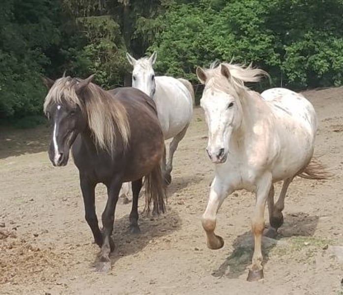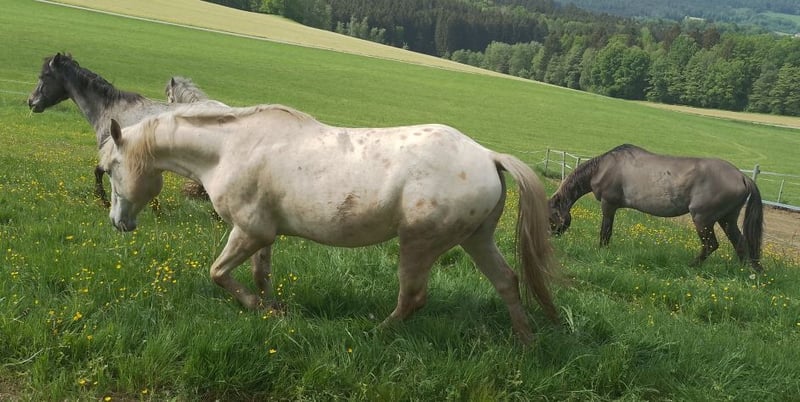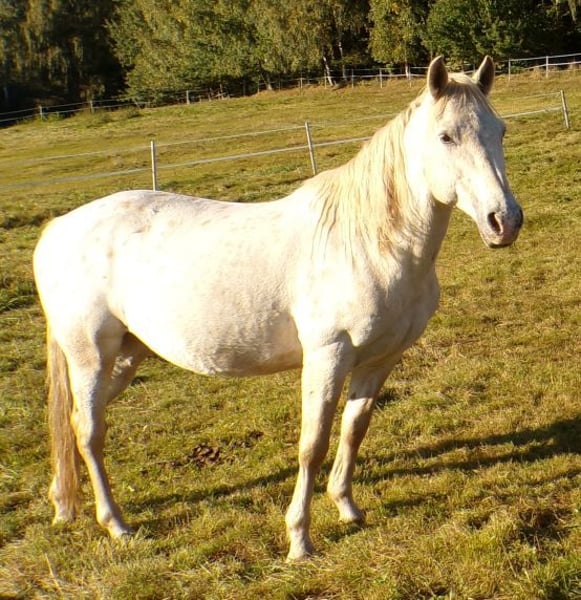 Our Jimmy is a sensitive and gentle gelding, easy to handle even by children, and he is safe without electric fencing. He has an incredible amount of tölt, although he hasn't been ridden for the past eight years. When he is stressed, he tends to weave, but since he lives in a herd in an open stable with us, we have not observed this behavior. Additionally, he has a crack in the horn of his front right hoof, but it has not caused any issues so far.