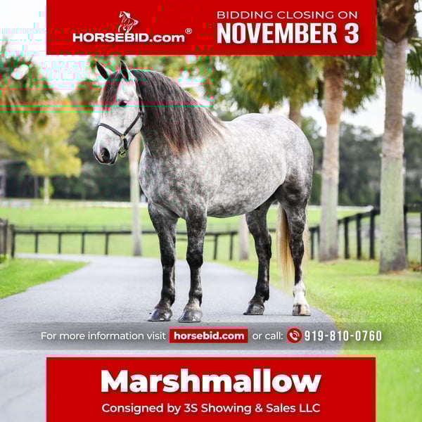 ⚜️𝐓𝐇𝐄 𝐅𝐀𝐋𝐋 𝐇𝐄𝐑𝐈𝐓𝐀𝐆𝐄 𝐂𝐋𝐀𝐒𝐒𝐈𝐂⚜️ Happening now thru MONDAY | NOVEMBER 3rd - Available EXCLUSIVELY on HorseBid's website! For more details and to register visit: www.Horsebid.com CONSIGNOR CONTACT: 3S Showing & Sales LLC 919-810-0760 LOCATION: Ocala, FL BREED: Percheron x QH cross REGISTERED: No REGISTERED NAME: Marshmallow COLOR: Grey HEIGHT: 15.3 AGE: 4 GENDER: Gelding 💛 Marshmallow 💛 15.3h | 4 Coming 5-Year-Old Percheron/Quarter Horse Gelding Safe • Steady • Kind • Once-in-a-Lifetime Some horses you train. Others are just born that way. Marshmallow is the latter. He’s one of those rare souls who seem to understand people—especially the ones who need a little extra reassurance. He doesn’t just carry his rider; he takes care of them. Whether it’s a nervous child, a first-timer, or someone rebuilding confidence, Marshmallow meets them with stillness, patience, and a quiet strength you can’t teach. Marshmallow has the softest eyes and the kindest heart. He rides, he drives (single and double), jumps, goes cross-country, crosses water, and handles every obstacle with ease. He trail rides through the woods and down the road, doing it all without fuss. He’s completely traffic-safe and sound in every way. 🌟 What Makes Him Special: • Beginner-safe – the kind of horse you’d trust with your kids, your guests, or someone just starting out • Rides & drives – pulls a cart just as happily as he packs a rider • Bombproof – traffic, dogs, flags, tarps, machinery—nothing shakes him • Versatile – rides English or Western, jumps up to 3’, and would excel as a foxhunter, lesson horse, or steady trail partner • Responsive & well-schooled – soft in the bridle, moves off your leg, frames up beautifully • Unshakable temperament – the same horse after time off, in new places, or with new people • Excellent ground manners – loads, ties, bathes, stands for the farrier, and meets you at the gate We’ve trusted Marshmallow with our most timid riders, and every single time, he’s shown up with calm, quiet confidence—like he already knew what they needed. He gives that confidence freely, never asking much in return. He just seems happiest when he’s helping someone feel safe. And while he’s built like a draft, Marshmallow is light on his feet, naturally balanced, and responsive. He’s athletic enough for someone who wants to ride, jump, or foxhunt, yet just as happy walking quietly through the woods on a long rein. Marshmallow isn’t just another “quiet gelding.” He’s the kind you wait years to find—maybe never find again. The one your kids grow up on. The one you trust with your heart. The one you’ll never forget.