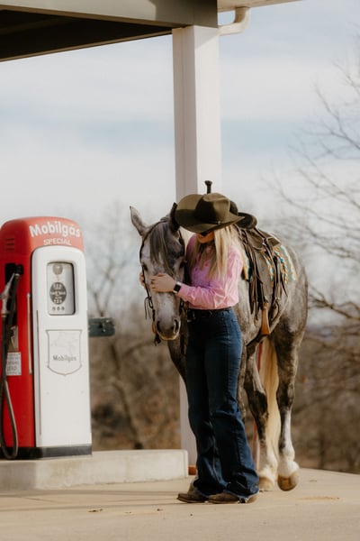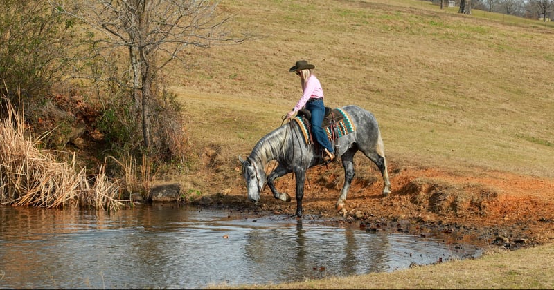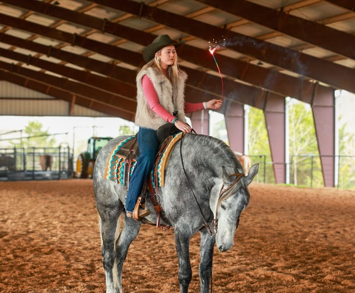 On the trail, Thor is thoughtful and steady, confidently navigating down timber, creeks, uneven footing, and changing terrain whether in a group setting or riding solo. He takes in traffic, fireworks, flags, tarps, and other unexpected situations with patience rather than urgency, staying present with his rider and moving forward with a relaxed, willing mindset. In the arena, he is fluent across disciplines, riding English or Western with equal ease, picking up both leads cleanly, offering a correct, powerful stop, and staying soft and responsive through his body. His natural balance, cadence, and presence point toward a serious future in dressage, while his scope and enthusiasm over fences make him equally compelling as a jumping prospect.