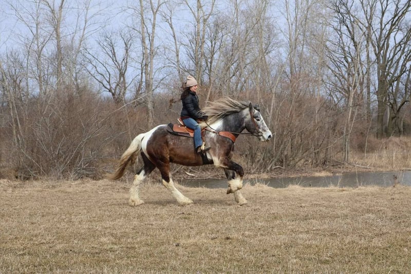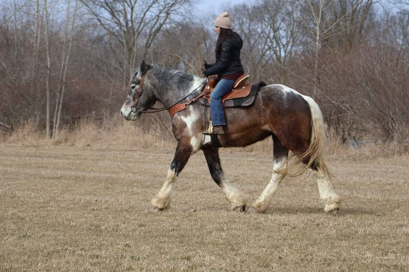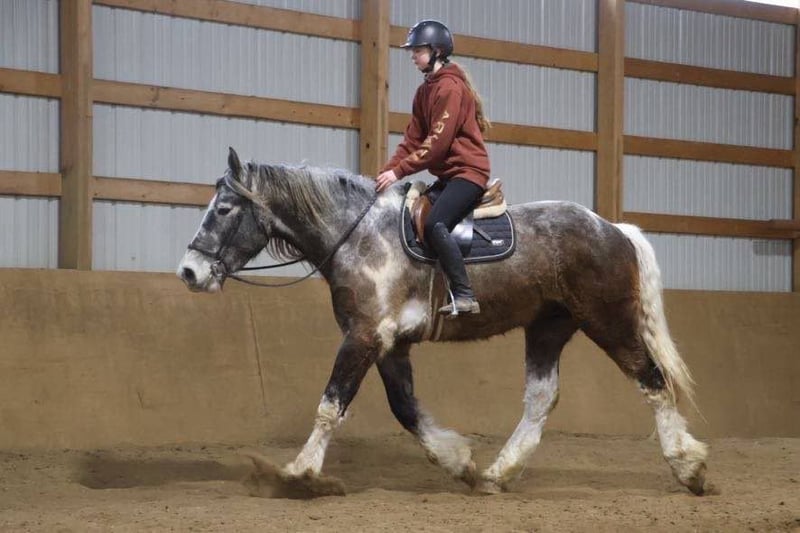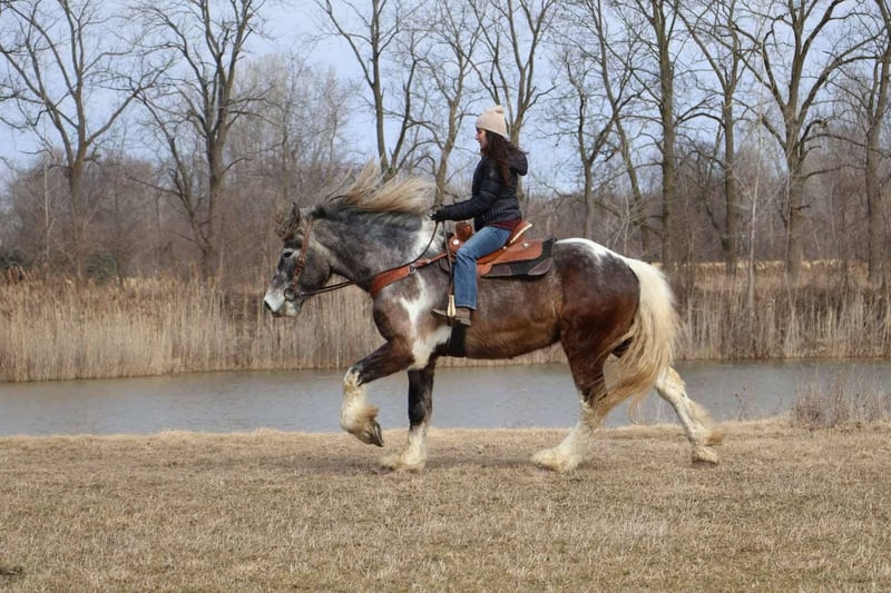ONLINE AUCTION Place your bids at www.PlatinumEquineAuction.com Starting Bid $3500 Auction ends May 25th, 2025 Need a new saddle? Check out White Rock Saddles on our website or Facebook! Meet Blackstone’s Big John! John is a 17.1hh uniquely colored rose grey and white painted Drum horse gelding. (Percheron, Spotted draft, Gypsy Vanner X) He is as gentle as a lamb. His mane and tail are very thick and natural wavey and he has beautiful feathering on all 4 legs. John is 4 years old. He’s big, he’s pretty, and best of all he’s quiet! John has a beautiful typey face and a kind and expressive eye. He’s the type of horse who wants to be your friend. John is so much like an over grown puppy dog he will follow you all over the pasture and even come trotting up when called. He truly is a best friend type of horse! Anyone can groom lead and handle him on the ground. He is also very easy to catch outside and plays well with other horses. John is nice and quiet under saddle. He works quietly in all gaits with his ears up while being relaxed and happy. He walk trot canters knows his leads and moves on and off your seat and leg. He is alert but shows calm and capable confidence in everything you ask of him! He has extensive trail miles and will go any direction you point him. He’s been down the roads and swam with the kayak’s. John also has some light mileage over fences and he’s bold and brave to any obstacle inside or out. You do not have to have a good eye to get this boy around!! He’s not reactive to new fences facilities or various types of fill. He has been ridden up and down the back roads of Michigan’s beautiful hunt country and would excel in fox hunting. Overall John is a laid back ride but he will move thru the paces off of your voice. He has been hauled to various parks and schooling shows and is very level headed in new places! John is also broke to drive and will work happily in a team or alone. He’s an all around boy that’s got a unique look and is a true a joy to have in the barn. Serious inquiry’s and a loving home only! Big John is located in Howell, MI 48855 give Ellesse Schwartz a call or text 248-390-6831 for more information. ONLINE AUCTION Place your bids at www.PlatinumEquineAuction.com Starting Bid $3500 Auction ends May 25th, 2025 Need a new saddle? Check out White Rock Saddles on our website or Facebook!