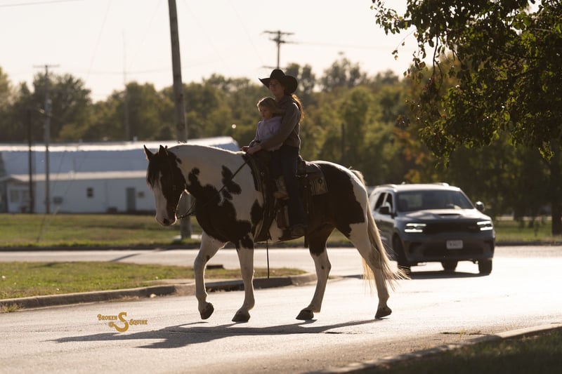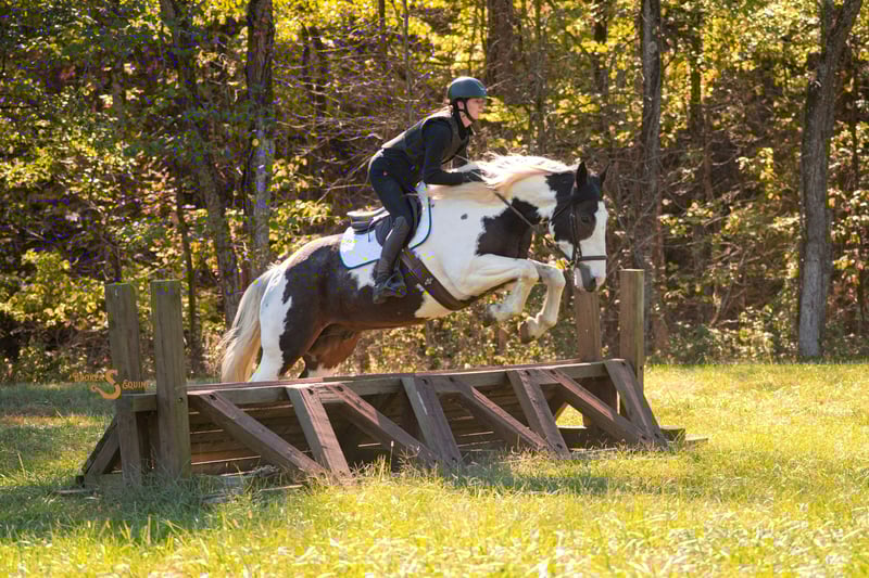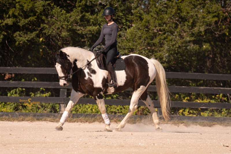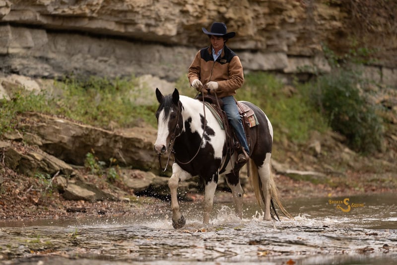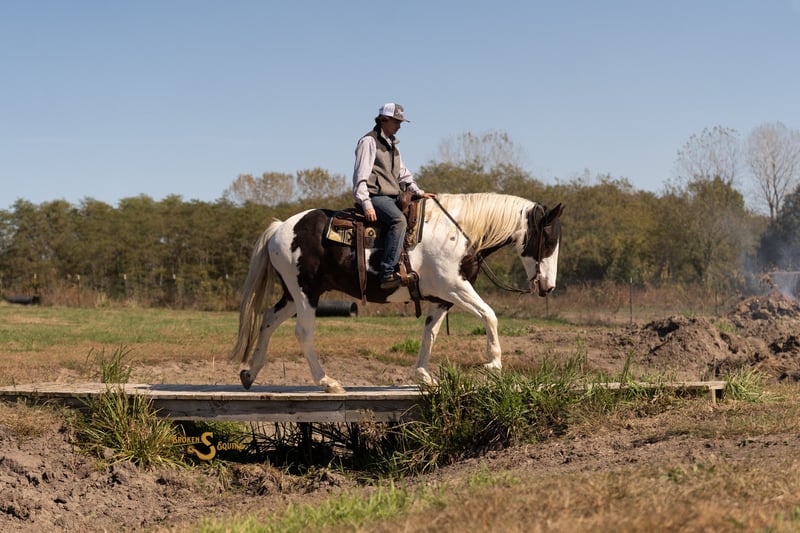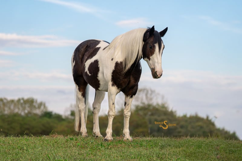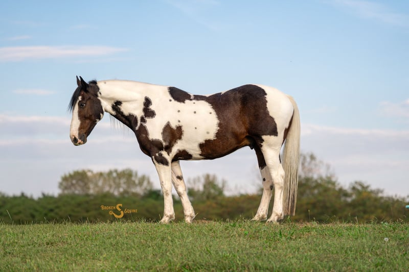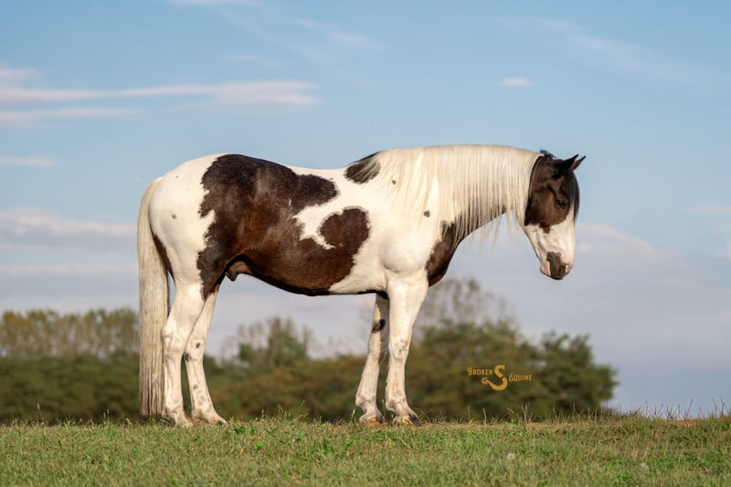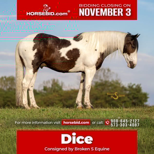⚜️𝐓𝐇𝐄 𝐅𝐀𝐋𝐋 𝐇𝐄𝐑𝐈𝐓𝐀𝐆𝐄 𝐂𝐋𝐀𝐒𝐒𝐈𝐂⚜️ Happening now thru MONDAY | NOVEMBER 3rd - Available EXCLUSIVELY on HorseBid's website! For more details and to register visit: www.Horsebid.com CONSIGNOR CONTACT: Broken S Equine Kieran 908-645-2127 or Beau 573-303-4087 LOCATION: Bogard, MO BREED: Percheron x Paint REGISTERED: No COLOR: Black and White Paint HEIGHT: 16.2 AGE: 5 GENDER: Gelding Dice is a 5 year old Percheron x Paint gelding standing 16.2 hands high. This is the type of horse I am suggesting to 99% of our clients because he is the perfect mix of safety, beauty, and ability. Dice is a simple and enjoyable mount to take lessons on, go to clinics and fun shows, or to take out to hunt. He is sturdy and gentle enough for the husband or guests to trail ride on, and has the personality that everyone just loves. He’s just the right mix of athletic ability and steady eddy, which is sometimes a hard thing to find in a draft cross. If you want to do some eventing or dressage, he can. And if you want to throw a timid beginner on in a lesson or trail ride, you can do that too. In the ring, Dice is quiet and easygoing. His gaits are comfortable and very easy to sit, and he is the perfect mix of whoa and go. He doesn’t feel like a heavy draft horse, but also never feels like he’s going to go faster than you want him to. He picks up both leads, will carry himself round in the bridle when asked, and has great brakes. He is tolerant of all types of riders and can be trusted with beginners and timid riders alike. He is so much fun on the cross country course, and pops over anything that’s asked of him. He has seen all of the fences in hunt country; coupes, logs, walls, banks, and ditches. Off property and on the trails, Dice is a superstar. He’s gone on various trips to lessons, trail rides, clinics, and to school. He has quickly become a favorite in dressage lessons, and gets attention anywhere he goes! On the trails, he crosses all water, bridges, tunnels, and varying terrain. He is safe in traffic, and rides through town like a pro. Dice may lack the speed for a first flight horse in a fast moving hunt, but absolutely has the brains and foundation to go in other fields or be a steady hill top partner. He has been exposed to hounds, and ridden through hunt country. In the barn, Dice is everyone’s favorite. He is Mr. Personality! He loves people, and loves attention. In the pasture, he’s the first to the gate to greet you, and he will follow you around like a puppy dog around the farm. Dice is happy living inside or out, and gets along well with his pasture mates. ⚫️Dice is an easy keeper with no quirks or maintenance. We have a recent, clean vet check on file. ⚫️Our program aims to train and produce top quality horses and ponies for all disciplines and experience levels. Check out our website for testimonials! ⚫️We are located in Bogard, MO. We can help you arrange shipping anywhere! ⚫️For more information about Dice, or any of our other horses call or text us. Kieran 908-645-2127 Beau 573-303-4087