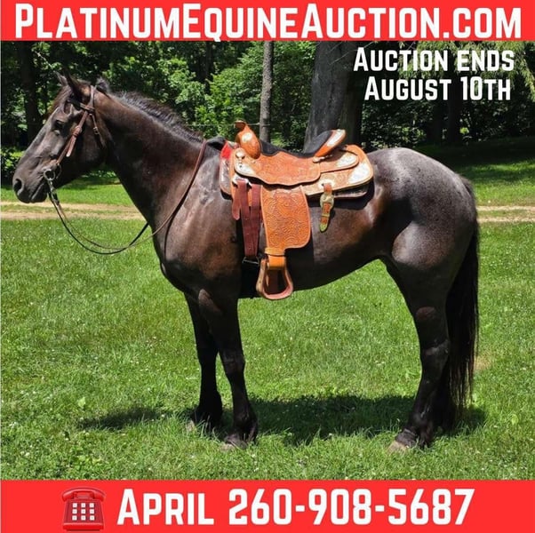 ONLINE AUCTION Place your bids at www.PlatinumEquineAuction.com Starting Bid $3500 Auction ends August 10th, 2025 Need a new saddle? Check out White Rock Saddles on our website or Facebook Aspen is a 6 year old blue roan Percheron, Quarter Horse cross mare. Standing a stout 16.3 hands tall, weighing around 1,300 pounds. Aspen was a therapy horse before she came to us. After we recieved her, she has been predominantly trail ridden by teenage girls. She is a load and go type horse. She does not take consistent work. She has great ground manners, loves a bath and does not hesitate over much of anything. She is good out in the pasture with other mares, geldings and babies. She doesn’t mind arena work, and loves the trails. Aspen will go in the deepest water and cross logs like a champion! She will go up and down any hill that is put in front of her. She will ride with a big group or alone. Aspen has a nice trot and lope. She can be ridden double, english, western and bareback. You can ride her with or without a bit. She has been ridden on the roads and through town. She has been around other livestock, cows, dogs, goats ect. She is no stranger to a hard days work. She is farm equipment broke and cart broke as well. If your looking for a good all around family horse, here’s your girl! Come take a look and see for yourself! Please contact for more information! We can set up shipping to ensure she arrives to her new forever home safely! Located in Camden, MI. For more info contact April with Mid-West Performance Horses 260-908-5687. ONLINE AUCTION Place your bids at www.PlatinumEquineAuction.com Starting Bid $3500 Auction ends August 10th, 2025 Need a new saddle? Check out White Rock Saddles on our website or Facebook
