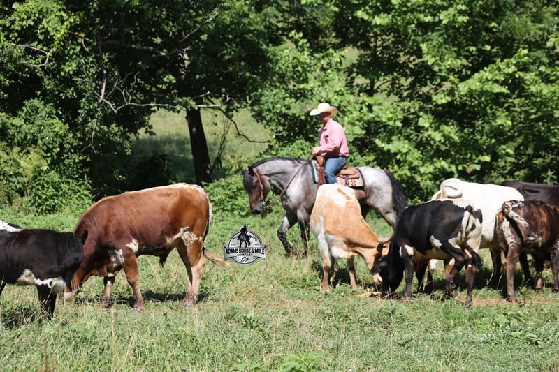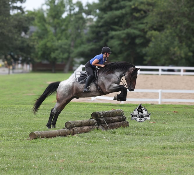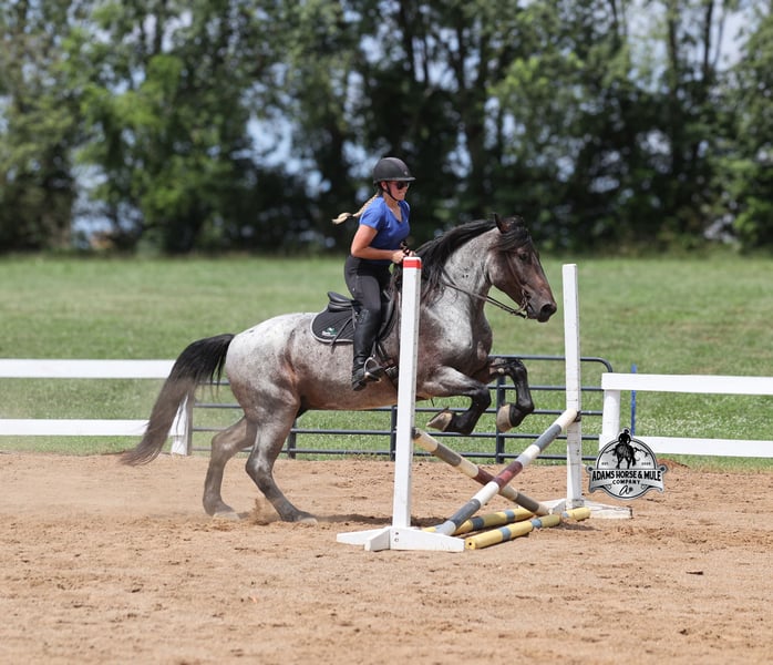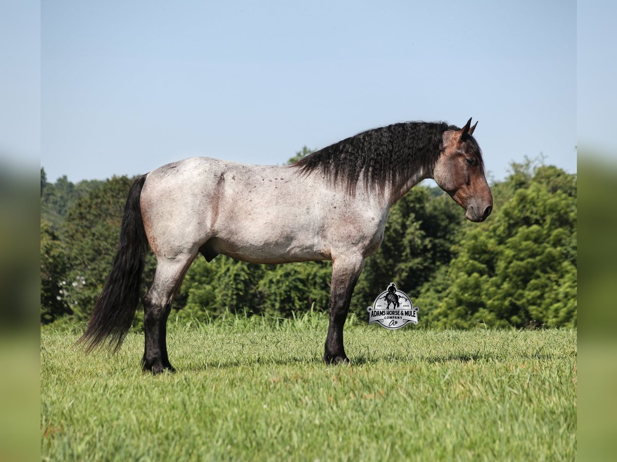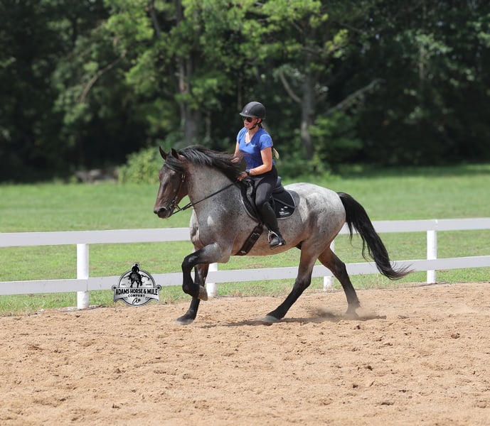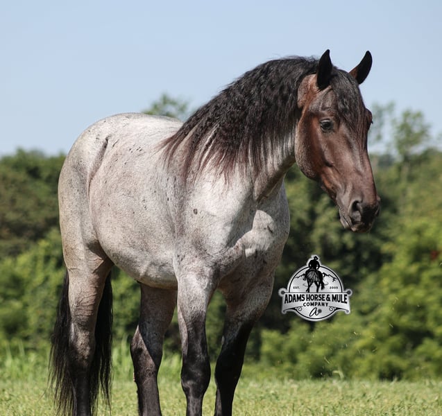 Rango is consigned to the Best Of The West Horse Sale in Gladstone, NJ on September 26-27th. You can bid online or bid in person. There is a preview day before the sale or you can come ride him prior to the sale in Mt. Vernon, KY. Rango is a 16h, 6 year old, Blue/Bay Roan Draftcross, gelding with movie star good looks, muscles upon muscles and that beautiful roan coloring you’d expect to see Rango on a Hollywood movie screen… Rango is trained to lay down and sit on command and he likes to show off his talents. He has been ridden around the ranch and used at brandings. Rango has a smooth trot, takes his leads and will lope nice circles. He neckreins around, has a good stop, sidepasses to open/shut gates and backs with ease. Rango has been exposed to all kinds of wildlife and he has been used in the mountains for hunting. Rango is great on the trails, he picks his way through rocky terrain, crosses deep water, scales slopes with ease and walks across deadfall as well. In addition to riding western he has been ridden English and has been over the jumps! Rango holds steady coming into the jumps and lands balanced. He has also been driven down the highways under harness and is traffic safe. Whether you want to ride around the ranch, trails, drive, do jumps or just lay down and take a nap together… Rango can do it all! For more info call 606-308-2461.