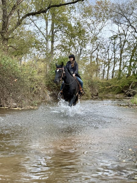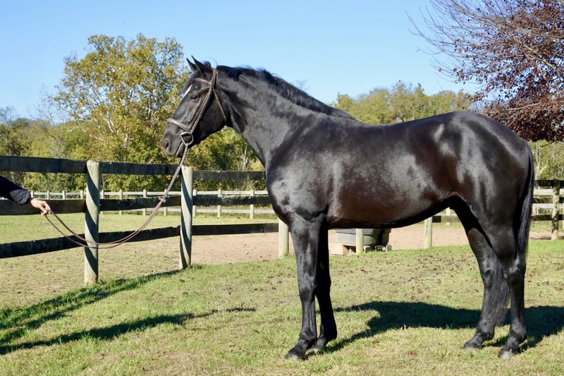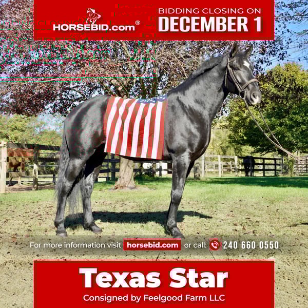 ⚜️ 𝓽𝓱𝓮 𝐇𝐨𝐫𝐬𝐞𝐦𝐚𝐧'𝐬 𝓢𝓱𝓸𝔀𝓬𝓪𝓼𝓮⚜️ Happening now thru MONDAY | DECEMBER 1st - Available EXCLUSIVELY on HorseBid's website! For more details and to register visit: www.Horsebid.com CONSIGNOR CONTACT: Feelgood Farm LLC 240 660 0550 LOCATION: Tuscarora, MD BREED: Percheron x WB REGISTERED: No COLOR: Black HEIGHT: 17.1 AGE: 6 GENDER: Gelding TEXAS STAR Tall, dark, and handsome! Texas Star is a 17.1 hand, 6 year old, percheron cross gelding. Gorgeous, young, and professionally started this guy is not one you'll want to miss out on! He is a total dreamboat with good looks and a super sweet disposition. Tex is comfy enough to ride all day and smooth enough to write home about! He is sturdy as they come and athletic enough to do any job; and handsome to boot. Texas Star is well broke English and Western. He has three lovely, adjustable gaits both inside and outside of the ring. His canter is uphill, adjustable, and rhythmic - it’s truly to die for. He is happy to go trail riding, cross water and bridges, take a jumping lesson, or show off in the dressage ring. With his western training, he excels in ranch and pleasure work. He can go on a leisurely trail ride one day and tackle a jumping lesson the next. He responds well to seat and leg cues and is soft in the bridle. He also has great movement, smooth transitions, and flashy looks that would make him a standout in the dressage ring. On the ground, Texas Star is sweet and respectful. He picks up his feet politely and is good for bathing. He lives next to a gun range and is used to loud noises. He is snuggly, but never pushy. He loves being groomed and would be happy to hang out with you all day. He will always make you smile with his puppy dog personality and his sweet demeanor. In the field, Tex is easygoing in a herd. He can be turned out with others and he is good in a stall. He is easy to catch and usually meets you at the gate. Texas Star is an easy keeper. He does not currently take any supplements or require maintenance. He has no known vices of any kind. He has great feet and a solid build. No known soundness or health issues. Horses like this don’t come along often. What makes this horse special is that he is always agreeable and sensible with great manners and incredible athleticism. This is the type of horse you always look forward to seeing. Texas Star is ready to find his special someone! Comes with a CLEAN PPE, and we can help arrange shipping anywhere.