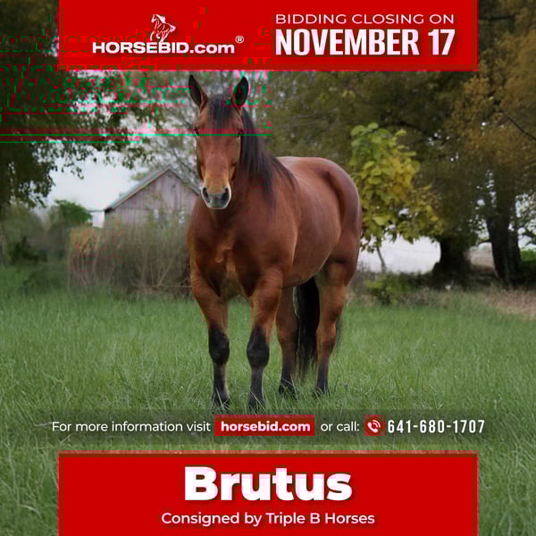 🎲𝓽𝓱𝓮 𝐑𝐈𝐃𝐄𝐑'𝐒 𝓒𝓱𝓸𝓲𝓬𝓮🎲 Happening now thru MONDAY | NOVEMBER 17th - Available EXCLUSIVELY on HorseBid's website! For more details and to register visit: www.Horsebid.com CONSIGNOR CONTACT: Triple B Horses 641-680-1707 LOCATION: Plano, Iowa BREED: Percheron/ QH REGISTERED: No COLOR: Bay HEIGHT: 15.3 AGE: 8 GENDER: Gelding Let me introduce Brutus- if you were to google “built like a brick house” He is the first picture that would pull up! Brutus is WIDE! He is the perfect age at 8 years old and stands 15.3 hands tall! He the perfect cross of Percheron and Quarter Horse. I don’t know even know where to begin to describe how this guy rides. He is PHENOMENAL! He is user friendly, soft, supple, and so smooth! For as big as he is he is as sure footed as a mule! Brutus originally came from a dude ranch out west and ended his carrier there just because he was “to broke” for the city people. But don’t let that scare you! Brutus can still easily be rode and enjoyed by a begginer under guidance! He will side pass, pivot, lope collected circles, and plant his butt in the dirt! Out on the trails he will cross water, logs, and ditches with ease! He is also traffic safe and rides through town with no issues! Take this big bus up the local gas station and pack all the beverages you want back home on him! Brutus is currently owned by Noah Troyer and is with me on consignment. Noah has rode this horse to the pond and fished right off his back. He’s packed several string full of fish back home on him. He’s helped move cattle for the neighbor, and he has also drove him! There truly isn’t any job Brutus won’t do! He has no vices, no bad habits, easy keeper. 100% sound with a clean PPE on file! Please feel free to call me at 6416801707 I’d love to talk about him!