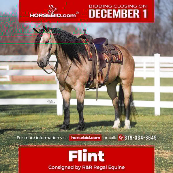 ⚜️ 𝓽𝓱𝓮 𝐇𝐨𝐫𝐬𝐞𝐦𝐚𝐧'𝐬 𝓢𝓱𝓸𝔀𝓬𝓪𝓼𝓮⚜️ Happening now thru MONDAY | DECEMBER 1st - Available EXCLUSIVELY on HorseBid's website! For more details and to register visit: www.Horsebid.com CONSIGNOR CONTACT: R&R Regal Equine 319-334-8649 LOCATION: Independence Iowa BREED: Percheron quarter horse cross REGISTERED: No COLOR: Buckskin HEIGHT: 15.3 AGE: 7 GENDER: Gelding 🔥 FOR SALE: Flint – Stunning 7-Year-Old Buckskin Gelding 🔥 Meet Flint, a striking 7-year-old buckskin crossbred gelding standing a solid 15.3 hands. This eye-catching gelding turns heads everywhere he goes with his color, build, and confident presence. Flint is trained in both English and Western disciplines, giving him exceptional versatility. Whether you want to hit the trails, school in the arena, or enjoy a relaxing ride around the farm, he’s ready to go. He is also broke to drive, making him an excellent option for someone seeking a true all-around partner. This gelding is athletic, intelligent, and responsive. Flint has a solid foundation and enjoys having a job. He’s the type that bonds well with his rider and gives his best when he has clear direction. Flint is not a beginner horse. He thrives with a rider who is experienced, confident, and capable of guiding him. In the right hands, he has all the potential to excel and continue to develop into a standout, dependable mount. If you’re looking for a beautiful, versatile gelding with tons of potential and presence, Flint is one you don’t want to miss.