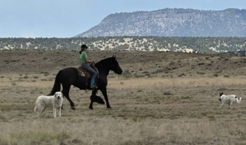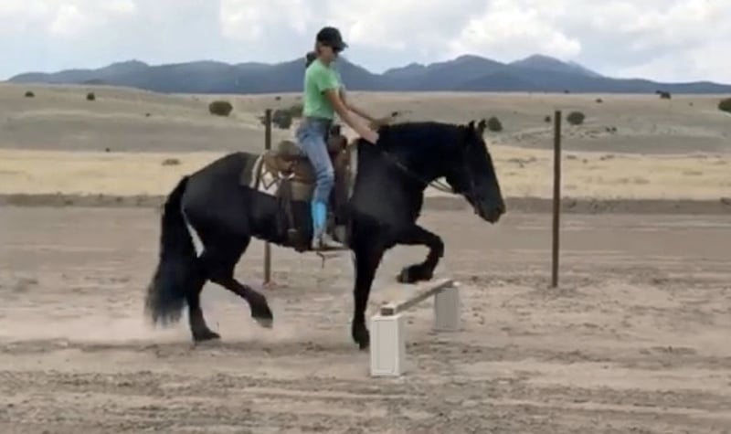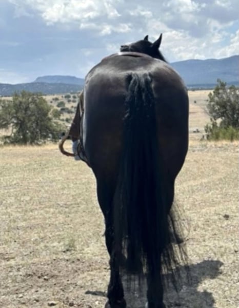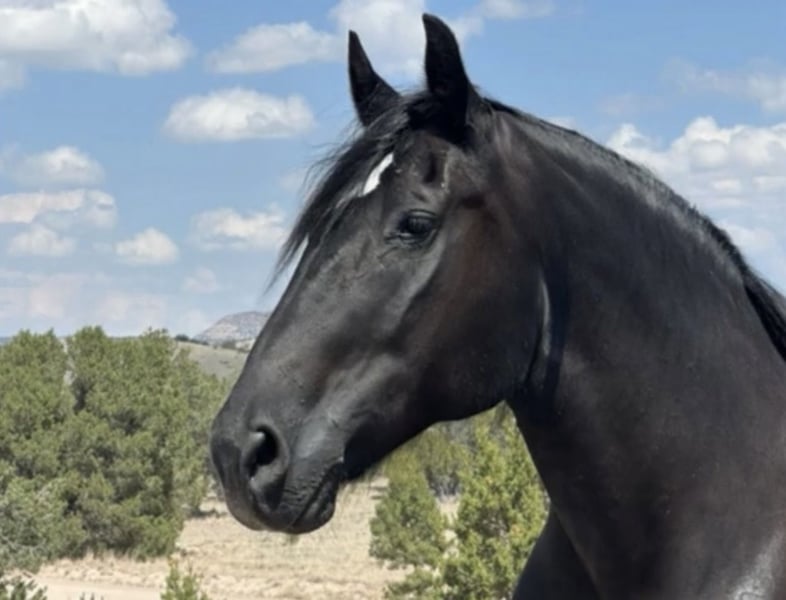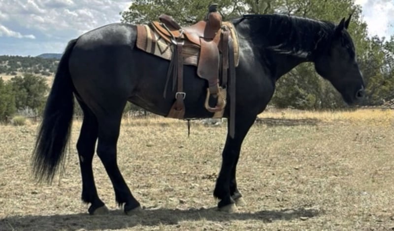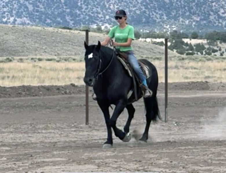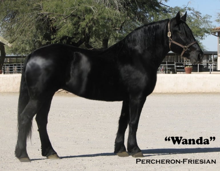 Wanda is a dream horse deluxe. Big Beautiful and super fun to ride. She stands an impressive 15.3 and is coal black. She has the massive presence of a Percheron with the elegant movement of a Friesian cross. She is very well broke both in the arena and on the trails. She has a smooth sitting trot and a nice lope. She is easy in her transitions and responds to voice commands. Wanda has been used in a lesson program with riders of all levels including seniors and children. She has always been safe and steady while doing her job. Wanda has many miles out on the ranch and the trail. She has been ridden around cattle, atvs, farm equipment and most everything else you find on ranch. Wanda has also been ridden in town, crossing some busy streets and always been trustworthy and safe. Wanda is very good with the farrier and enjoys being groomed. She stands tied quietly for a bath, brushing and is good with the clippers. Wanda has a kind and friendly disposition. She meets you at the gate and lowers her head to be haltered. Wanda is a barn favorite and has been a super fun to have around. If you are looking for a big, elegant trail partner that is also a deluxe to ride in the arena Wanda may be a great fit.