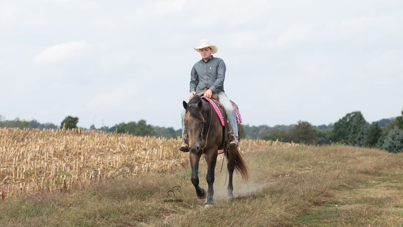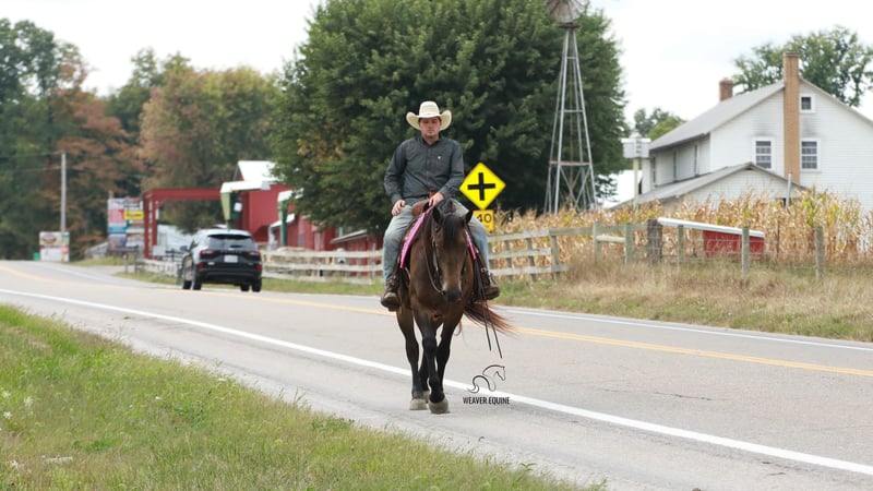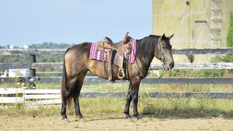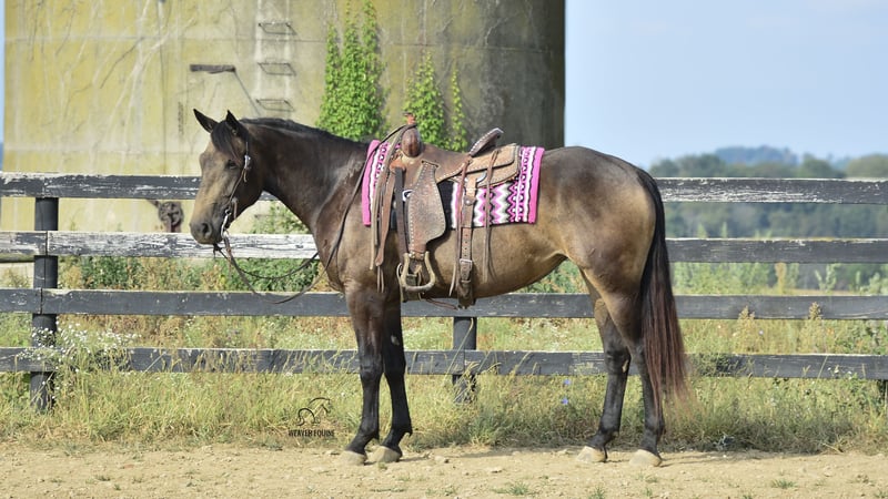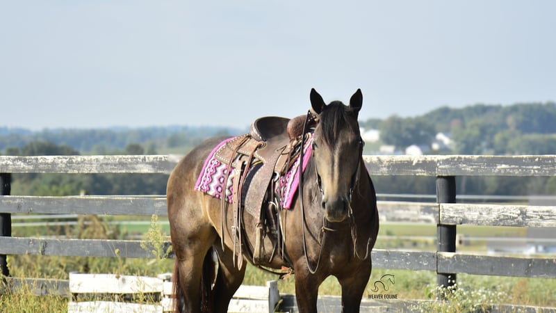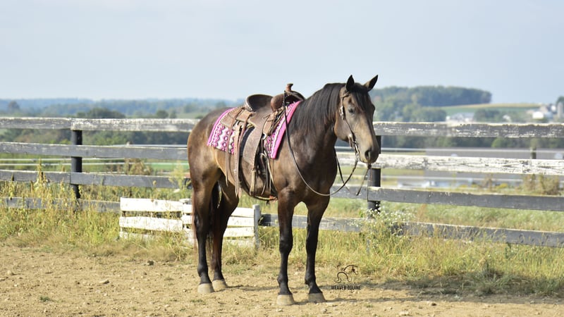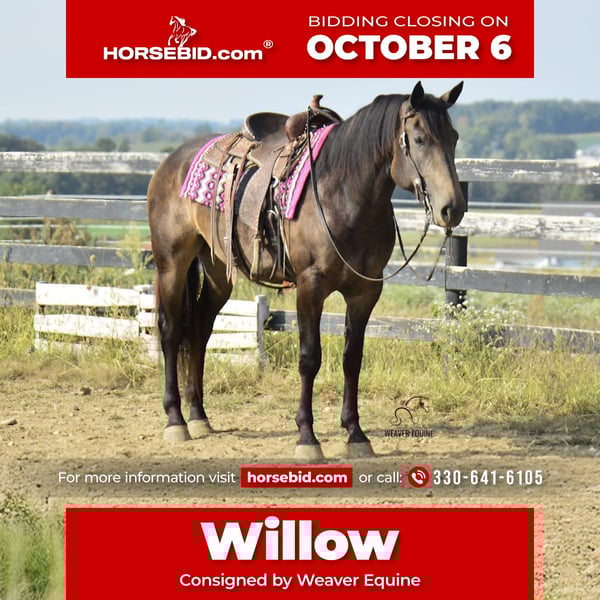🍂 𝓐𝓾𝓽𝓾𝓶𝓷 𝑨𝑳𝑳 𝑺𝑻𝑨𝑹 𝑳𝑰𝑵𝑬𝑼𝑷 🍂 Happening now thru MONDAY | OCTOBER 6th - Available EXCLUSIVELY on HorseBid's website! For more details and to register visit: www.Horsebid.com CONSIGNOR CONTACT: Weaver Equine 330-641-6105 LOCATION: Fredericksburg OH BREED: Percheron/Quarter Horse REGISTERED: No REGISTERED NAME: Willow COLOR: Buckskin HEIGHT: 15.3 AGE: 4 GENDER: Mare Meet Willow! A beautiful 15.3 hh percheron/quarter horse cross mare. She is a pretty buckskin color and has a super sweet attitude! Willow is well broke to ride. She is a great horse, whether you prefer trail riding, arena riding, out with friends or alone, in the traffic, or just a leisure ride at home! She lopes a circle nicely in the arena. She stops and stands when asked. Her walk, trot, canter transition is beautiful! She will stand nicely at a mounting block. Crosses the obstacles with ease! Does not mind a tarp or flag. Super level headed horse! Quiet natured and loves her job. She will easily trot & lope on command. Super easy to love! She does an excellent job on the trails. She does not mind the hills. Crosses creeks and logs with ease. She will happily ride out alone or with a group. She has also been ridden out in traffic. She does great out and about! She does not mind loading and unloading on a trailer. Willow is easy to handle in the saddle as well as on the ground. She is super well mannered! She stands nicely tied on a lead line or in the cross ties. She will ground tie as well. She is super gentle on the lead line. She does great when pastured out with other horses. Easy to catch. She stalls nicely as well. Easy keeper! No maintenance! 100% sound!