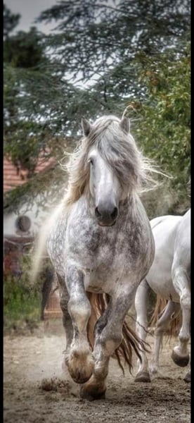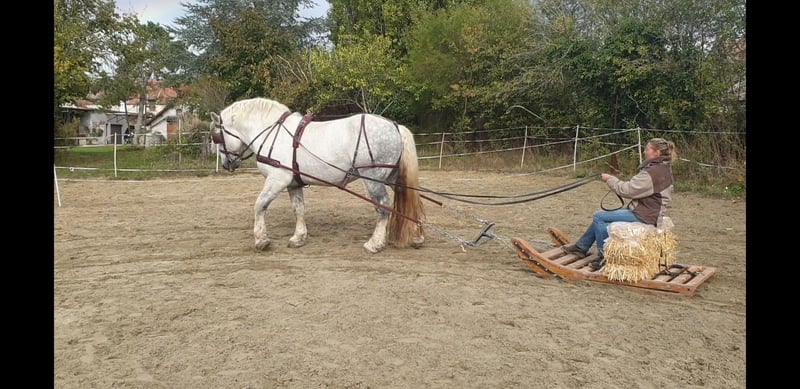 Hola, soy Biky, un dulce semental de Percheron de 14 años y un gran oso de peluche. Llevo una vida maravillosa aquí en Francia: siempre estoy al aire libre con mi amigo, con heno a voluntad y un refugio para los días en que hace demasiado húmedo para dormir afuera o cuando hace demasiado calor. Solo me aburro un poco porque mi propietaria suele estar lejos por trabajo. Si pudiera encontrar un lugar tan genial como este — ¡y por favor, NUNCA en una caja! — y alguien que tenga tiempo para pasar conmigo, consideraría mudarme. Me encantan los paseos, disfruto mucho del trabajo en libertad, y también estoy bien entrenado en doma clásica. Además, paso la rastra en la pista y me encanta acurrucarme. Subo fácilmente al remolque y me comporto muy bien. Mi propietaria dice que soy un chico fantástico. Si quieres conocerme, no dudes en llamarla. ¡Estoy deseando recibir tu visita! 🙂