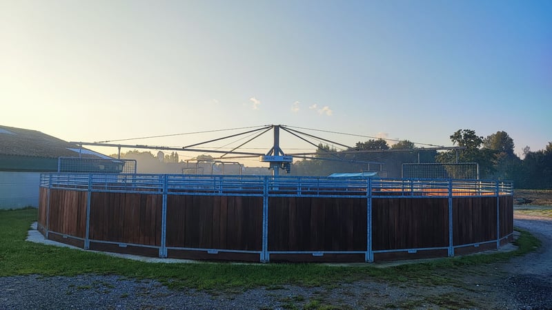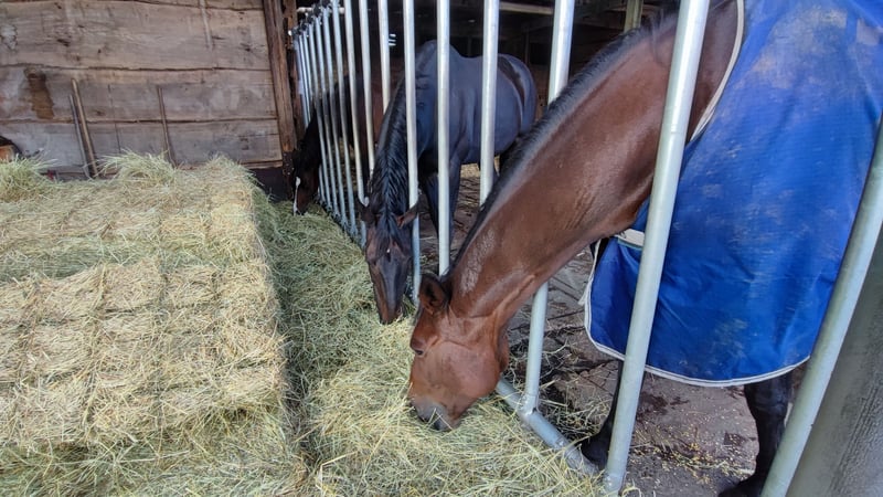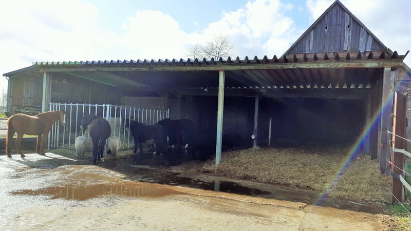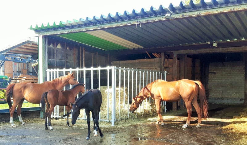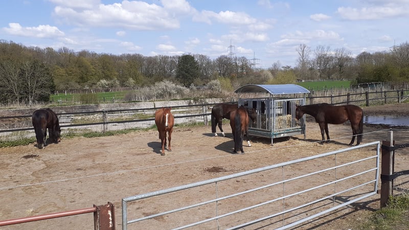 Der Offenstall besteht aus einem Unterstand mit Tränke und zwei Futterstellen. In den Sommermonaten können die Pferde selbstständig auf die angrenzenden Weiden gehen.
