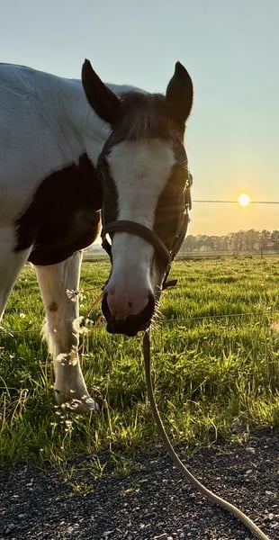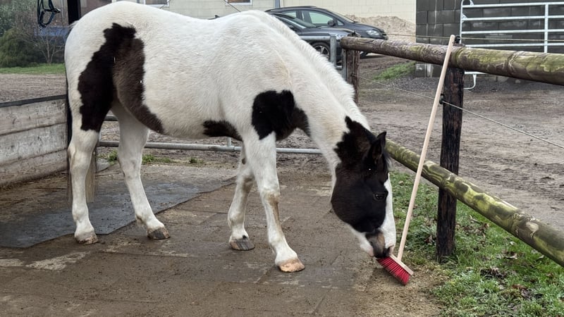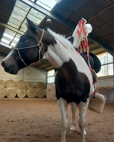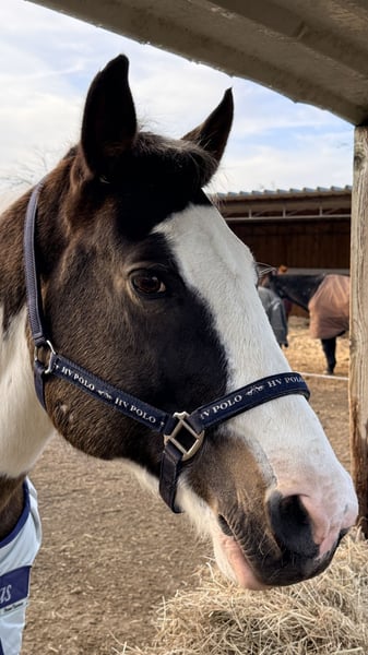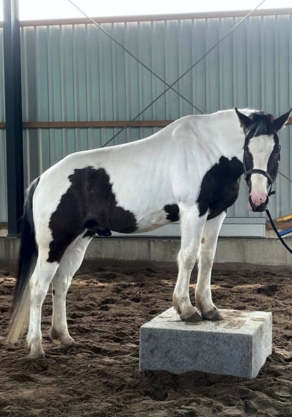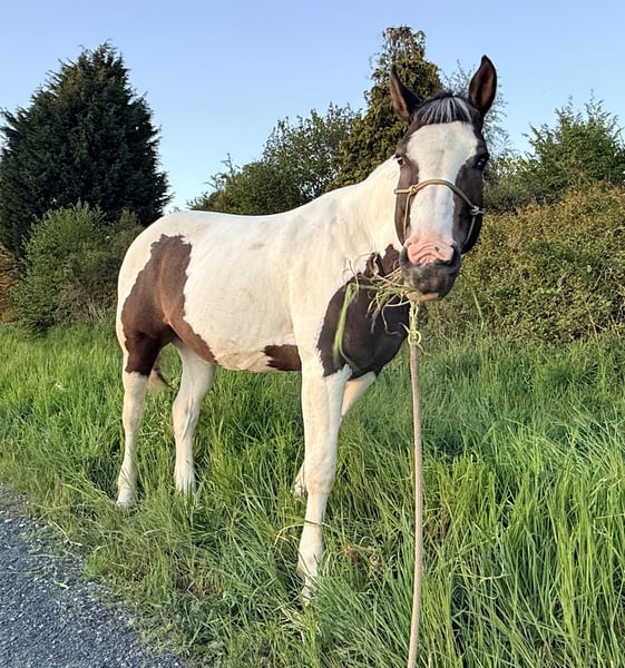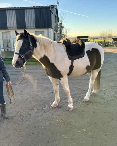 „BumbleBee“ ist ein 13-jähriger, hübscher Pinto / Paint Schecke, der von uns Ende 2024 als angerittenes Anfängerpferd für die weitere Ausbildung gekauft wurde. Unterm Sattel zeigt er sich aber nun bei Schenkeldruck nicht kooperativ, verschließt sich und stellt jede Zusammenarbeit ein. Es folgen dann auch Beißversuche und ggf. Buckeln. Vermutlich hat BumbleBee in seiner Vergangenheit leider sehr schlechte Erfahrungen machen müssen, die uns beim Ankauf verschwiegen wurden. Nach fachlicher Einschätzung wird dieses Verhalten bei BumbleBee nur durch einen Profi auf Dauer händelbar sein. Daher wird BumbleBee ausdrücklich als nicht reitbar angeboten. BumbleBee wurde von uns nach pro-ride Horsemanship nach Thomas Günter auf dem Boden ausgebildet und desensibilisiert. Arbeit mit der Longe sowie die Freiarbeit kennt er. Er ist neugierig und unerschrocken. Entsprechend entspannt ist er auch gerne im Gelände unterwegs. Grundsätzlich ist BumbleBee ein sehr menschenbezogener, netter und freundlicher Freizeitpartner mit einem großen Herz, der gerne auf dem Boden arbeitet. Dabei ist er total unkompliziert. Er ist ein verlässlicher Begleiter im Gelände; am Boden. BumbleBee ist rangniedrig und gegenüber seinen Artgenossen freundlich und neugierig. Aktuell steht BumbleBee in einer Box mit Außenpaddock. Er kennt aber auch den Offenstall. Das Stockmaß von BumbleBee ist etwa 1,58 m. Er besitzt einen spanischen Equidenpass, wurde regelmäßig geimpft (Influenza, Herpes, Tetanus), entwurmt und wird als Barhufer alle 4 Wochen dem Huforthopäden vorgestellt; dort ist er absolut schmiedefromm. Eine jährliche Zahnkontrolle (zuletzt 11/2025) erfolgte ebenfalls. Den Tierarzt empfängt er stets entspannt. Unterjährig hat er temporär (Pollensaison) Atemwegsprobleme mit Husten und bekommt bei uns daher gewässertes Heu. Aktuell ist er beschwerdefrei. Wir wünschen uns für BumbleBee ein neues Sterne-Zuhause, wo man Spaß an der Bodenarbeit hat, oder aber wo er als Handpferd, oder zu Fuß mit seinem Menschen draußen unterwegs sein kann.