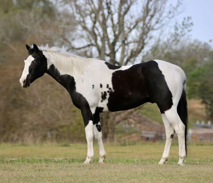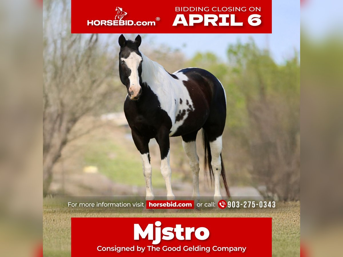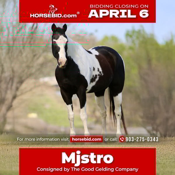 🌟𝑨𝒑𝒓𝒊𝒍 𝐀𝐋𝐋 𝐒𝐓𝐀𝐑 𝐋𝐈𝐍𝐄𝐔𝐏🌟 Happening now thru MONDAY | APRIL 6th - Available EXCLUSIVELY on HorseBid's website! For more details and to register visit: www.Horsebid.com CONSIGNOR CONTACT: The Good Gelding Company 903-275-0343 LOCATION: Athens, TX BREED: Pinto REGISTERED: Yes REGISTERED NAME: GGC Mjstro COLOR: Black and white Tobiano HEIGHT: 15.2 AGE: 14 GENDER: Gelding Mjstro is the kind of gelding that checks every box for someone looking for a safe, reliable, and enjoyable partner without sacrificing looks. This 14-year-old black and white tobiano gelding stands 15.2 hands and has the kind of eye-catching presence that turns heads everywhere he goes—highlighted by his striking blue eyes and bold markings. Mjstro has been a steady, trusted member of a lesson program, and it shows in every ride. He is forgiving, patient, and consistent, making him suitable for beginners while still being enjoyable for more experienced riders. He rides both English and western with ease, quietly doing his job and taking care of his rider every step of the way. Out on the trail, Mjstro is just as solid. He goes where you point him, stays level-headed, and handles new environments without fuss. Whether you want to ride alone or in a group, he’s the same dependable horse every time—no surprises, no nonsense. On the ground, he’s as easy as they come. Mjstro has a friendly, “in your pocket” personality and genuinely enjoys being around people. He’s easy to catch, simple to handle, and good for the farrier. He fits seamlessly into a program, family setting, or as a personal horse for someone wanting a no-drama partner. He is sound with a set of X-rays on file and requires no maintenance or special care—just saddle up and enjoy. If you’re looking for a safe, versatile gelding that you can trust and enjoy every day, Mjstro is one that’s hard to replace.