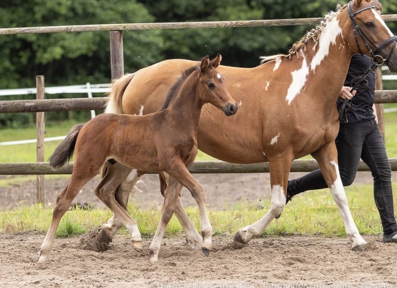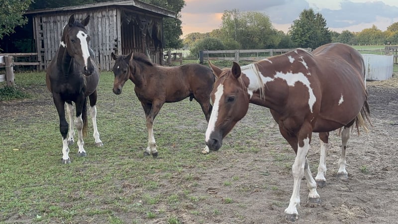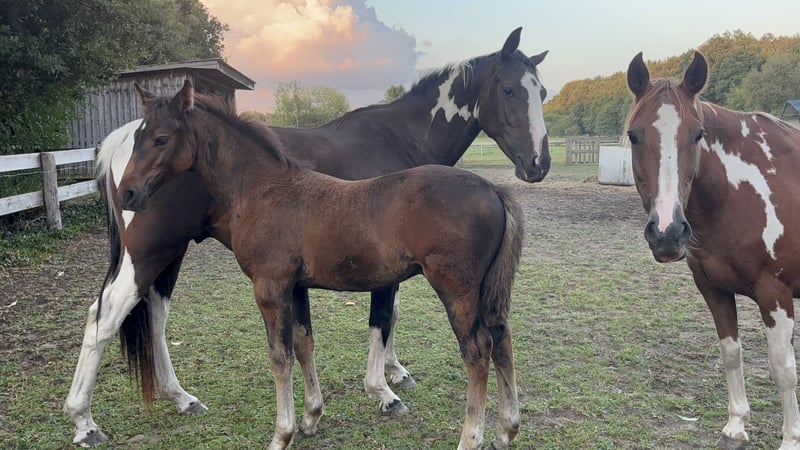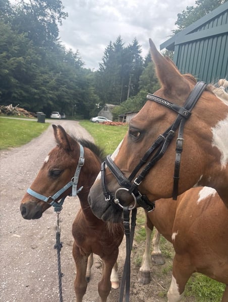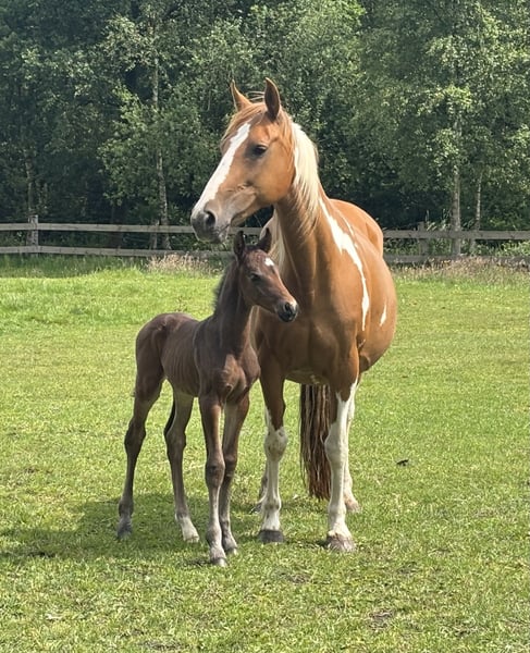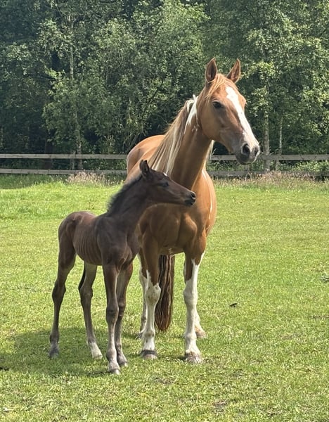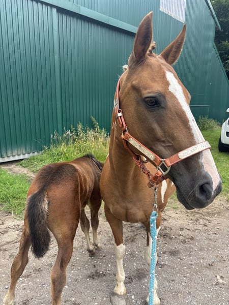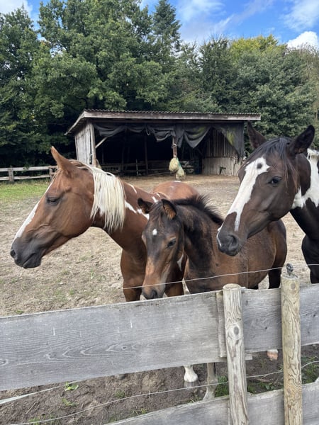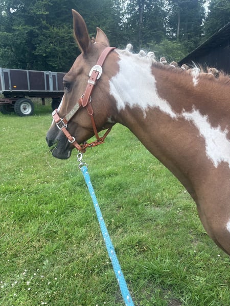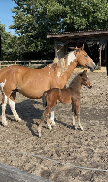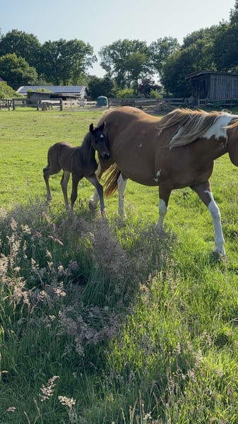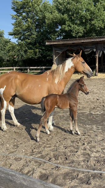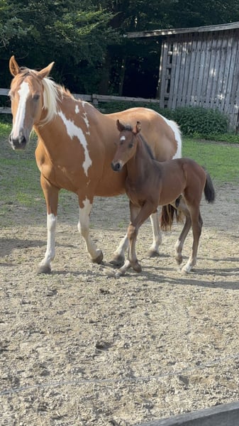 With a very heavy heart, I have to part with my beloved Pinto mare due to health reasons. She is an absolute sweetheart in handling and very cuddly. Lilly has just turned 15 years old and stands approximately 1.45 meters tall. She is currently ridden recreationally with a Western saddle in the countryside, both in a group and alone. At the moment, she has a colt on foot, who is also looking for a new home. After weaning the foal, she would need to regain some muscle. Otherwise, she remains gentle even after a longer break. In recent years, she has given birth to several colts and is a very good mother. The births were always uncomplicated. Her foals are incredibly sweet and relaxed, have correct conformation, and have received the foal premium. She has full papers from ZfdP. Her two-year-old son is also still with me. The foal will be weaned in December. At that time, Lilly could move or someone might choose to take both together. In the case of dominant mares, she ranks low in the herd, and I do not want her to experience stress again from being chased. She should definitely be kept in a herd and preferably in an open stable. She enjoys grooming with the other horses and has been kept exclusively outdoors for many years. I am looking for someone who will give her lots of love and attention. She gives so much to her human and should also receive only the best. She will be handed over with a Western saddle and bridle. She is vaccinated, dewormed, and also farrier- and loading-friendly. Price without foal: €4,800 VB, including accessories. Price with foal: €7,000
