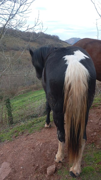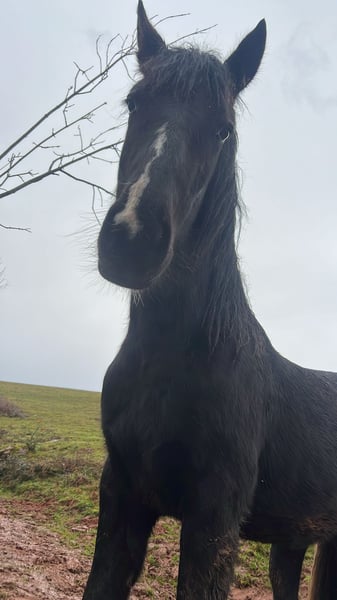 Available for sale: an exceptional filly named Valentine. A highly sought-after cross that combines the majesty and bone structure of the Friesian breed (mother) with the distinctive coat pattern of the Pinto (father). Age: 18 months (a year and a half). Conformation: Large stature, excellent build, and elegant movements. She features a beautiful two-tone tail and a star. Temperament: Outstanding character. She is a very gentle filly, raised in close contact with humans and easy to handle. Ideal for someone looking for a future trustworthy riding horse.