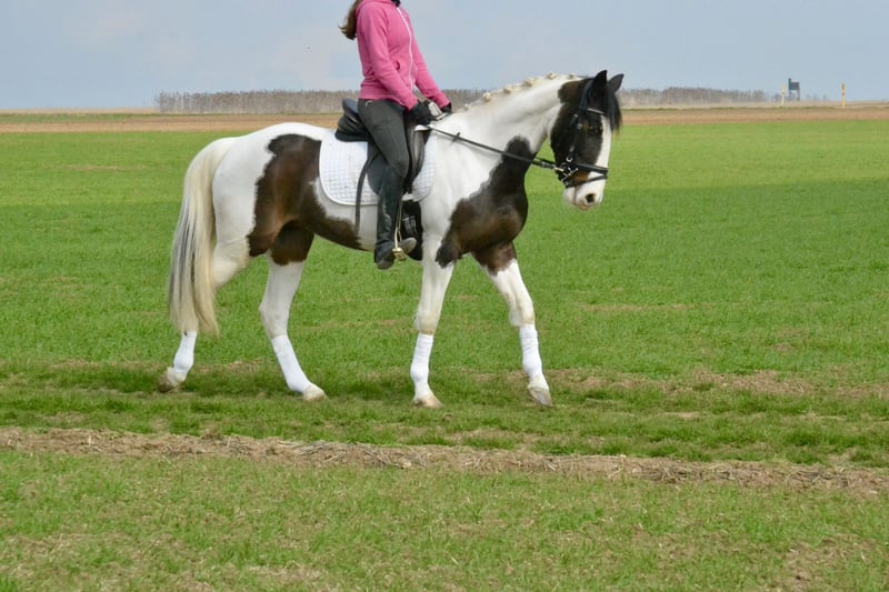 Zum Verkauf steht eine Scheckstute (6 Jahre, ca. 1,50 m), die sich als unkomplizierte und ehrliche Partnerin für Freizeit, Gelände und den täglichen Umgang zeigt. Die Stute ist brav im Umgang sowie unter dem Reiter und angenehm zu sitzen. Sie arbeitet motiviert mit und zeigt sich sowohl auf dem Platz als auch im Gelände zuverlässig. Im Gelände ist sie alleine sowie in der Gruppe unterwegs und dabei verkehrssicher. Auch im täglichen Handling ist sie unkompliziert (rangniedrig, schmiede- und verladefromm). Aufgrund ihres ausgeglichenen Charakters eignet sie sich gut für Wiedereinsteiger, schwächere Reiter oder als Familienpferd. Eine aktuelle klinische Ankaufsuntersuchung ohne Befund liegt vor. Weitere Untersuchungen sind selbstverständlich möglich. Videos (Reiten, Gelände, Umgang) können gerne zur Verfügung gestellt werden. Probereiten ist nach Absprache möglich (30 €, wird beim Kauf verrechnet).