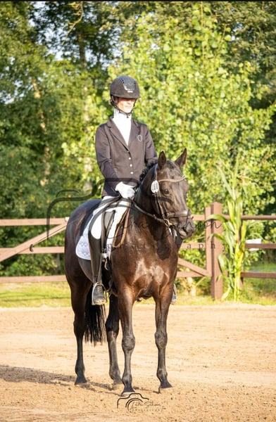 Are you looking for a suitable riding horse to make a successful transition? Then you’ve come to the right place! Samara is an eight-year-old dark bay mare (with a star-shaped blaze). She is well-behaved and very people-oriented. Her height is approximately 15.0 hh to 15.1 hh. Perfect for teenagers and small adults. She has been under saddle since May 2025 and consistently shows her best qualities. She has already competed in two shows, where she performed in an A dressage test, earning solid 6s. She handled these competitions confidently. On one occasion, she was the first horse in her class, and on another, she placed second. After just her second competition, lunging was no longer necessary. Although she is relatively new to riding, she already masters exercises such as leg-yield, enlarging the arena, shoulder-in, extending canter and trot strides, full halts, and much more. She is familiar with cows, tractors, and children. She is located on a farm. She knows daily turnout and is stabled at night. Both riding on the riding arena and in the indoor riding hall pose no problems. She is registered as a competition horse. Vaccinated in August. End of September, she had a wolf’s tooth extracted and hooks removed. She is accustomed to trailering, standing calmly and quietly during transport. From the saddle, she can open the sliding doors of the indoor arena as well as the band door of the riding hall. Breed: Sambero x Salvador