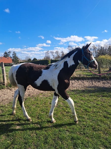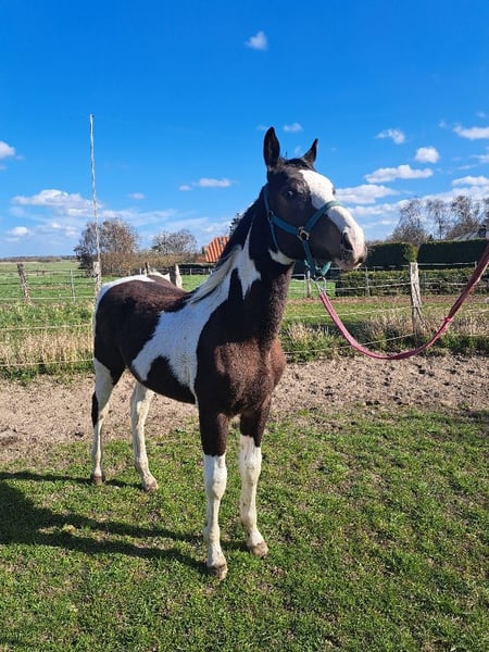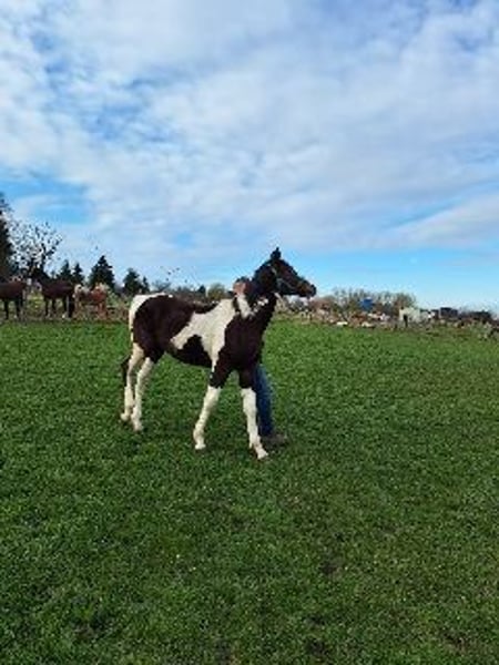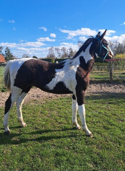 Braunscheckhengst geb.am 4.6.2025 Fohlenprämierung mit Note 8,5 Mutter Mecklenburger Pinto Vater Hengst Redefin Crawly Kennt Hufe geben Führen anbinden ist sehr lieb im Umgang