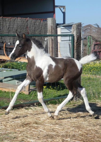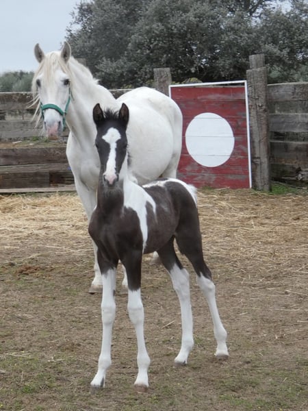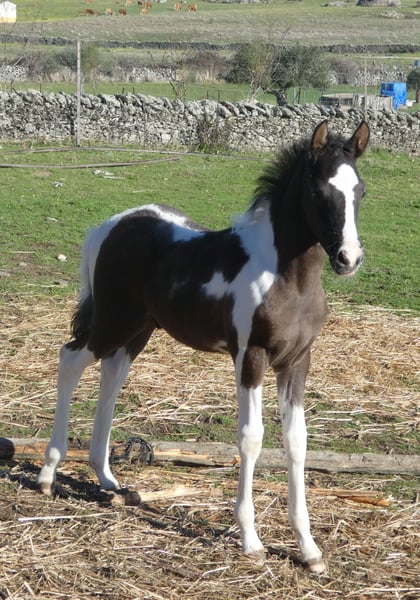 Potro pinto. Madre PRE y padre pinto ( madre pia de deporte alemán y padre Arábigo 50% hispano árabe). Buen carácter.