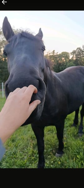 Il nostro puledro sorpresa Noel, nato a Natale, cerca una nuova casa. È nato il 24 dicembre 2022, quindi attualmente ha 2 anni e 9 mesi ed è già stallone. Purtroppo, sua madre, una splendida cavalla polacca di sangue Coldblood, non ci ha rivelato chi sia il suo padre. Data la sua apparenza e la sua linea superiore elegante, possiamo ipotizzare che potrebbe trattarsi di un cavallo Friese o di un'altra razza elegante simile. La madre ha un'altezza al garrese di circa 1,70 m, mentre lui misura attualmente circa 1,62 m. L'estate l'ha trascorsa insieme ad altri tre stalloni in paddock, ma lo scorso inverno è stato già lungi alcune volte al capannina con il cavezza.