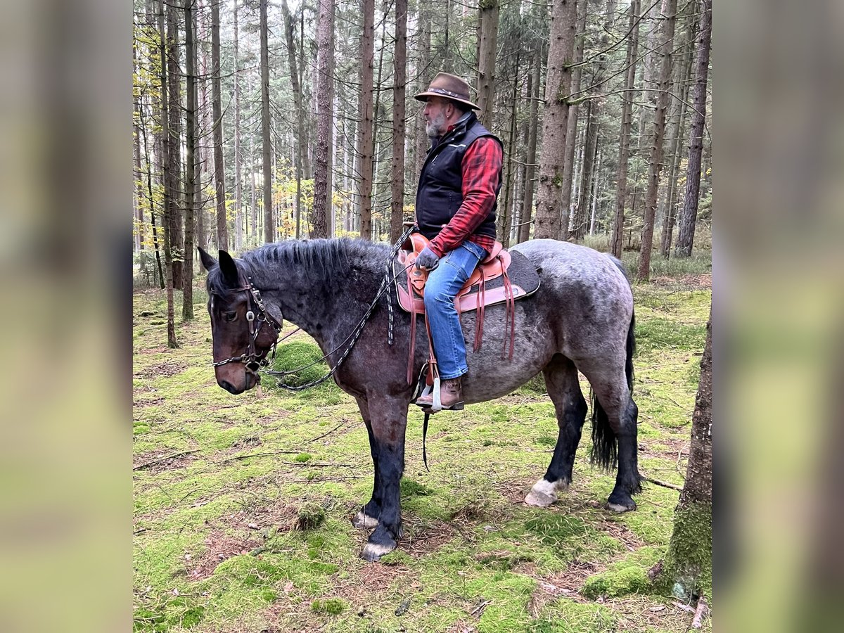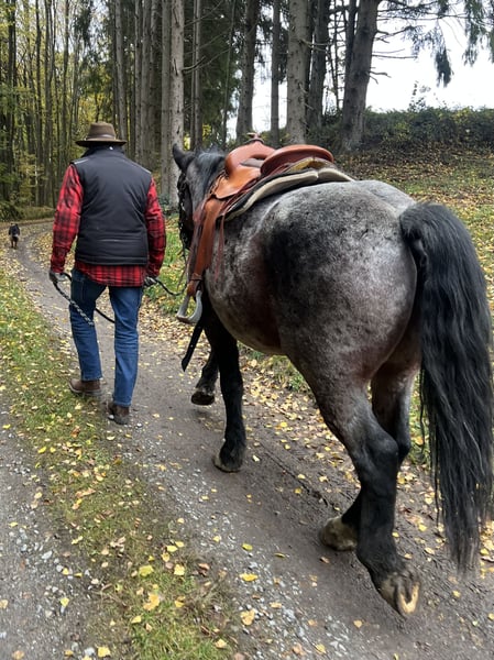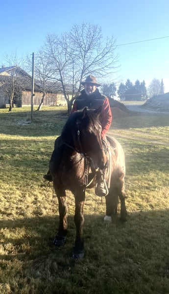 Cold-blooded crossbred gelding, ridden in all three gaits on a bit with water reins. Fearless, very sure-footed, comfortable going through water, traffic, with dogs, farrier, and loading… no problem. Safe electric fence, herd-friendly, loves the stable cat, responds to voice commands, and even fetches his feed bucket. BUT: dislikes groundwork, is reluctant to accept instructions from women and can show his strength! That is the reason for his sale. Our stable girls do not feel comfortable handling him. Therefore, ideally sold to a (male) individual who will give him work and not constantly coddle him. He would make an excellent trekking horse. Absolutely priority over price.