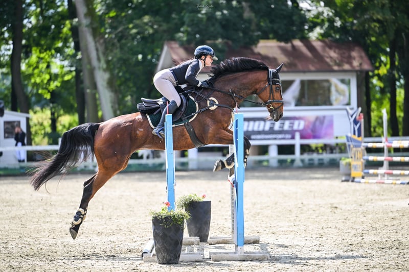 NIXON ist ein 12-jähriger Wallach mit einer Stockmaß von 167 cm. Er hat eine korrekte Körperhaltung, starke Hufe (vorne beschlagen). Das Pferd besticht durch sein engelsgleiches Wesen, ist unkompliziert und äußerst brav. Es ist sehr leicht zu reiten, verzeiht Fehler und ist stets auf der anderen Seite des Hindernisses, niemals verweigert es den Sprung. Ein idealer Lehr- und Freizeitpartner für Kinder und Anfänger, perfekt zum Einstieg in den Springsport und zum Ablegen von Abzeichen oder Lizenzen. Er ist bis zur Klasse P ausgebildet. Der Galopp ist gleichmäßig, er achtet nicht auf bunte Hindernisse oder Untergründe. Das Pferd besitzt aktuelle, klare Röntgenbilder vom Ende August. Preis: 40.000 zł, inklusive passendem Zubehör.