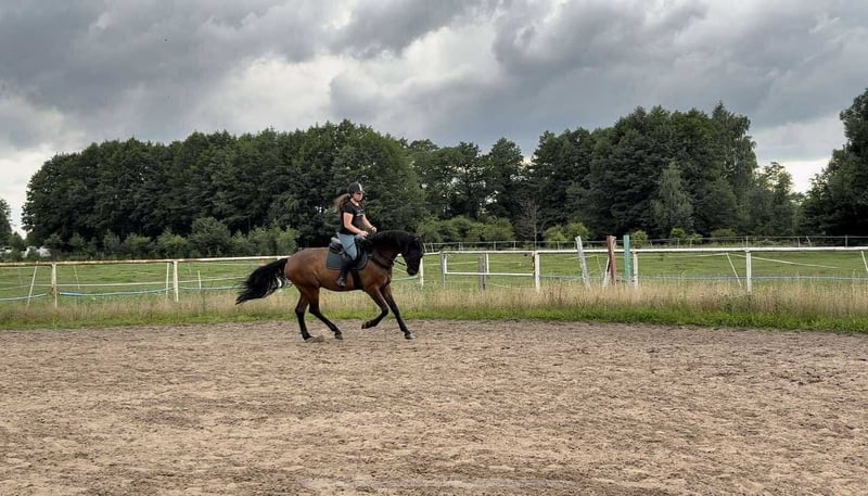 Handsome, well-built dark chestnut gelding sired by the stallion Love Affair – a horse of modern type with sporting potential. Approximately 16.1 hh, born on March 10, 2020. Castrated on April 9, 2024. TÜV examinations from March 2024. Temperamental and with character — not bucking or showing aggression, but requiring a confident, experienced rider who can work with horses of strong personality. Well-behaved during all handling (grooming, farrier, veterinarian). Preliminary lunged — accepted the saddle and rider, moves independently in walk, trot, and has begun cantering. Works on a lunge in all three gaits. Regularly exercised 3–4 times a week. Turned out in a small group of geldings. Healthy, vaccinated (including WZN), dewormed, teeth floated. For sale with a suitable saddle.