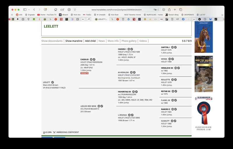 She is an exceptional combination of top jumping bloodlines (Cassini I and Ramiro Z) as well as the best Thoroughbred lines used in show jumping (Heraldik xx and Favoritas xx), with over 63% bloodlines in her pedigree.