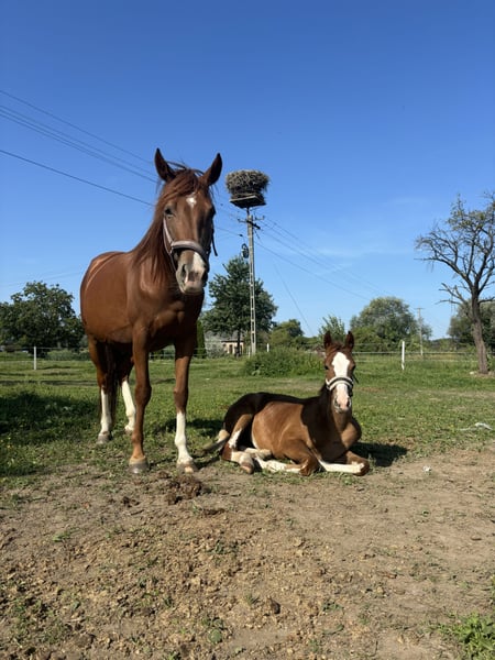 Stute, SP, 161 cm, geboren 2020. (Santos KWPN x Revel KWPN) Sie wird seit einigen Monaten geritten. Sie bewegt sich frei in drei Grundgangarten und hat ihre ersten Sprünge unter dem Reiter absolviert. Unter dem Sattel ist sie energisch und geht gerne vorwärts. Sie reagiert sensibel auf die Hilfen und arbeitet gerne mit. Sie buckelt nicht und zieht nicht durch. Sie hat keine Unarten und war nie verletzt. Zuvor wurde sie in der Zucht eingesetzt, sie ist gut tragend und bringt gut zur Welt, sehr gute Mutter.