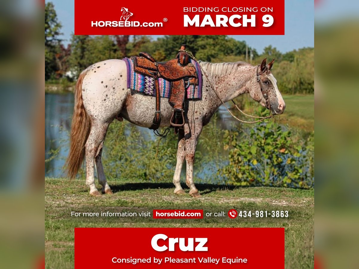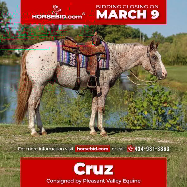 ℳ𝒶𝓇𝒸𝒽 ♦️𝐑𝐈𝐃𝐄𝐑'𝐒 𝐂𝐇𝐎𝐈𝐂𝐄♦️ Happening now thru MONDAY | MARCH 9th - Available EXCLUSIVELY on HorseBid's website! For more details and to register visit: www.Horsebid.com CONSIGNOR CONTACT: Pleasant Valley Equine 434-981-3863 LOCATION: Robards, KY BREED: POA REGISTERED: Yes REGISTERED NAME: Frost on My Zipper COLOR: Blanket HEIGHT: 14.2 AGE: 4 GENDER: Gelding Take a look at this stunning Appaloosa pony. Frost On My Zipper aka Cruz. With a huge show career in the POA racking tons of points by a 13 year old youth. Cruz has been competitively shown in Halter & In-hand Trail since he was a weanling. Cruz has points in Showmanship, Trail, Western Pleasure, Hunt seat. He would be a great 4H horse or small adult looking for a show horse. Cruz stands 14.2h tall & as fancy as they come. Cruz is broke better then most. He can lope off from a standstill and get his leads everytime. He also leg yields, side passes, yeilds his hind quarters, and can work a gate. Cruz been mainly used for pleasure events but has all the buttons to go show in the Ranch Riding, and Western riding events. He also is very classy in his english attire & excells in the show pen. If your looking for a horse to show in the trail. Cruz does that too. He one you can show off to all your friends. Cruz also enjoys trail riding and walks quietly down the trail on a loose rein and will cross creeks, ditches, logs, and water without hesitation. He's always the first to meet you in the feild. If your looking to excelling in Western Pleasure, Showmanship, Hunter-Seat, Halter, Equitation, Jumping, Trail Cruz is your guy. Don't miss out on this fancy pony that's sure to winn you blue ribbons. Cruz UTD on shots and coggins. He stands great for the farrier, baths, & clips Sells 100% sound and no vices. Call today to make an appointment to meet Cruz.