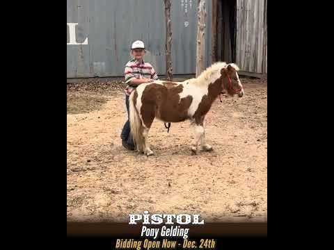 Pistol is a gorgeous paint with perfectly balanced red and white markings and a super sweet personality. He is 36” tall and 4 years old. Pistol has been in our family since he was a baby, and he has been this way his entire life. He faces everything with the confidence of an old, seasoned horse. Calm, quiet, and steady describe him perfectly. He will meet you at the gate or anywhere in the pasture and always loves it when it’s his turn for brushing, hoof picking, and riding. Pistol rides bareback and with a saddle, with or without a bridle, or even in just a hay string. In his 4.5 years, he has had 10 years’ worth of training and stays broke even with time off. He will ride quietly and calmly in the arena, barnyard, or on the trail. He will lead a trail ride or follow peacefully behind. He is fun and easy to ride, and he will keep your child safe at every stage, from playing at home to serious trail riding. Pistol is a rare gem of a pony and has his whole life ahead of him.