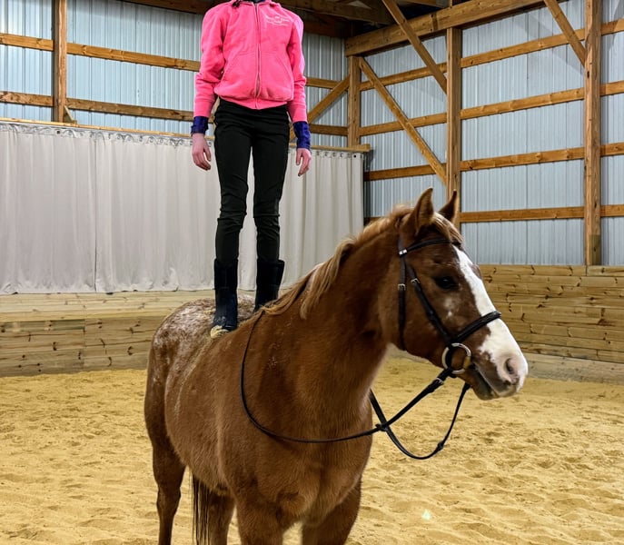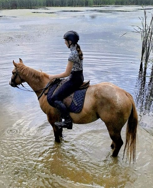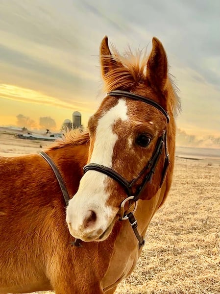 "AVAILABLE ON ONLINE HORSE AUCTION AT www DOT PlatinumEquineAuction DOT com BIDDING OPEN NOW thru SUNDAY | APRIL 26TH! *Final price will be determined on auction site* CONSIGNOR CONTACT INFO: Carmen Quandahl 563-387-7748 LOCATION: Ridgeway, IA If you’re looking for a true all-around pony who gets up every day ready for anything, meet Mulligan! Mulligan loves to go places and do all the things. He’s the kind of pony that happily goes from kid lessons to adult schooling rides to 'beverage consumption trail rides' without missing a beat. Safe, polite, and uncomplicated on the ground and under saddle, he’s a confidence builder without being dull. Although we primarily ride him in English/Jumping tack, he has also been ridden in Western tack. He will go exactly the speed you want: English trot or Western jog, Canter to jump a cross-country fence or Lope quiet circles on a long rein. He “gallops” cross-country and slow jogs bareback. (And by “gallop” I mean he is absolutely convinced he’s the next Secretariat and we won’t tell him any different.) One minute he’s getting gritty and competitive playing horseball, the next he’s quietly standing while kids practice 'around-the-world.' (See ‘Good Boy, Mulligan’ video link below!) Mulligan loads himself, trailers like a pro, stands perfectly for the farrier, and clips without drama. He enjoys jumping a course, then happily walks out on the trail. Currently used in kid lessons, but he’s a fun, balanced, and easy ride for adults as well. He has schooled over fences up to 24” and has a solid understanding of shoulder-in, haunches-in, and leg yield. Ready to show Training Level dressage or at an open show in Horsemanship, Equitation, or Pleasure. Mulligan is the rare pony that can truly do it all. He has a great brain, a great attitude, and just enough pony confidence to keep things fun. Ponies like this don’t come along often! “Why is he for sale?” My business plan involves breeding, raising, starting, and training ponies to become well-socialized, happy partners for adult amateurs and kids. I can’t keep them all for myself and the banker makes sure I stick to the business plan. “What does he eat?” 1 cup Platinum Performance GI and 1# Purina Enrich “What are his living arrangements?” Outside 24/7, as much as possible, weather dependent. Currently with 2 other geldings. Not the boss but doesn’t get picked on. Still young, so likes to play on occasion. “Is there anything he is afraid of?” Missing dinner. That’s about it. “Does he have any vices – cribbing, chewing, biting, etc.?” No. He may paw in the cross-ties on occasion, but that is remedied with a short correction. “Is he up-to-date on teeth, deworming, vaccinations, etc.?” Yes. All of the above. Please contact Carmen with Quandahl Farm's Equine Athletes at 563-387-7748