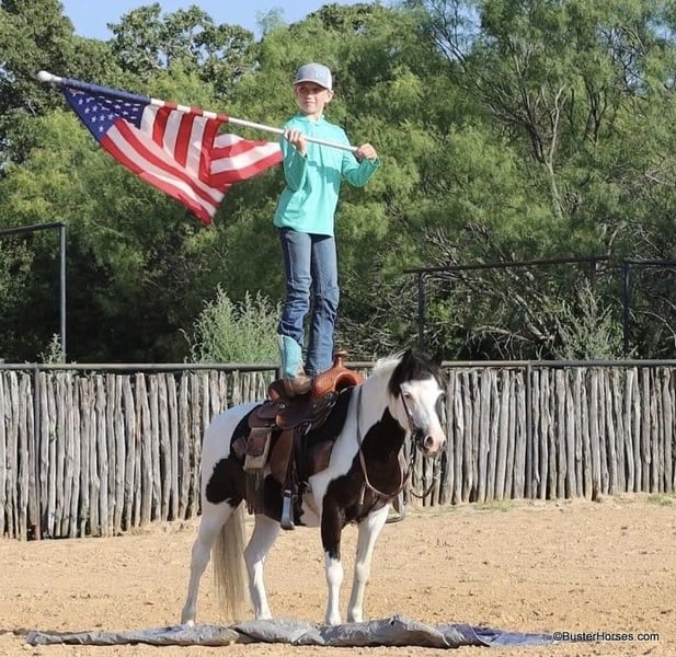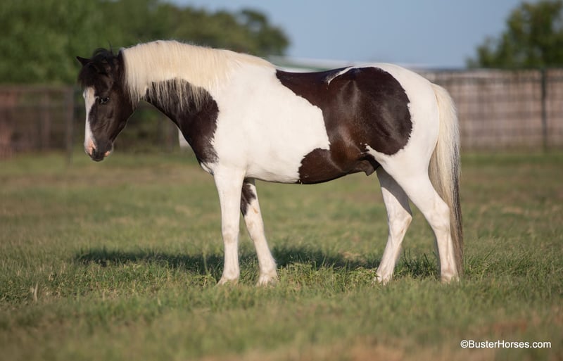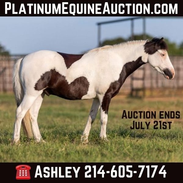 ONLINE AUCTION Place your bids at www.PlatinumEquineAuction.com Starting Bid $3500 Auction ends July 21st, 2024 Need a new saddle? Check out White Rock Saddles on our website or Facebook! Casper is a 10.3H, 5 year old black and white paint pony gelding If your child is looking for a pet dog they can have a relationship with – and also ride – then Casper is your pony. This little guy is about as fun, curious, and overly friendly as they come! – hence the name – He loves being with someone and loves having something to do and someone to be with. If you are wanting your kiddo to have that special friend that whineys and comes running when they get off the bus – this is one of those rare ponies that REALLY genuinely loves kiddos, being with you, and doing things with you. He will make many irreplaceable childhood memories. And he is just the perfect size for kids to be able to do it all on their own for many years, without outgrowing him too quickly. My kiddo in the video is 11, and tall for her age, this little guy is stout made and will last the kids for several years. If your kiddo watches the Heartland TV series, and dreams of the liberty work play, than he would be a great little teacher to learn the ropes on. This pony naturally joins up and follows you, and loves doing it. Separate from his super fun personality and being just adorable to have around, Casper also really rides around! He trot and lopes willingly, has a decent little work ethic, not at all the typical punk pony pushy attitude. He naturally carries himself balances and cadenced, is a cute mover, takes both of his leads simply and evenly, and he has a great stop. He travels around on a nice relaxed rein with his ears up. Casper does have a reasonable reserve, and he will go on my daughter’s “Rolex string” (you have to call and ask for an explanation on this definition). Casper is up-to-date- on all cares, was just trimmed this week, his teeth were also done by an equine dentist (right after this video was shot, we’ll try to get additional videos before sale time), he had his sheath cleaned, his ears treated for ticks, and he was also power packed wormed. He is good to shoe as well, but has great feet and goes really well barefoot – if his new owner prefers him to be shod, we can have him shod prior to him heading to his new home. He will arrive at his new home up-to-date and ready to go to work! We are experienced, knowledgeable sellers, and we can help with quickly arranging affordable shipping to any buyer’s location – we have experience shipping worldwide – including regularly to Hawaii, Canada, Mexico, Europe, and South Africa. Please go to our website for additional pics and videos BusterHorses.com Call Buster Horses Ashley 214-605-7174 Located in Weatherford, TX. ONLINE AUCTION Place your bids at www.PlatinumEquineAuction.com Starting Bid $3500 Auction ends July 21st, 2024 Need a new saddle? Check out White Rock Saddles on our website or Facebook!