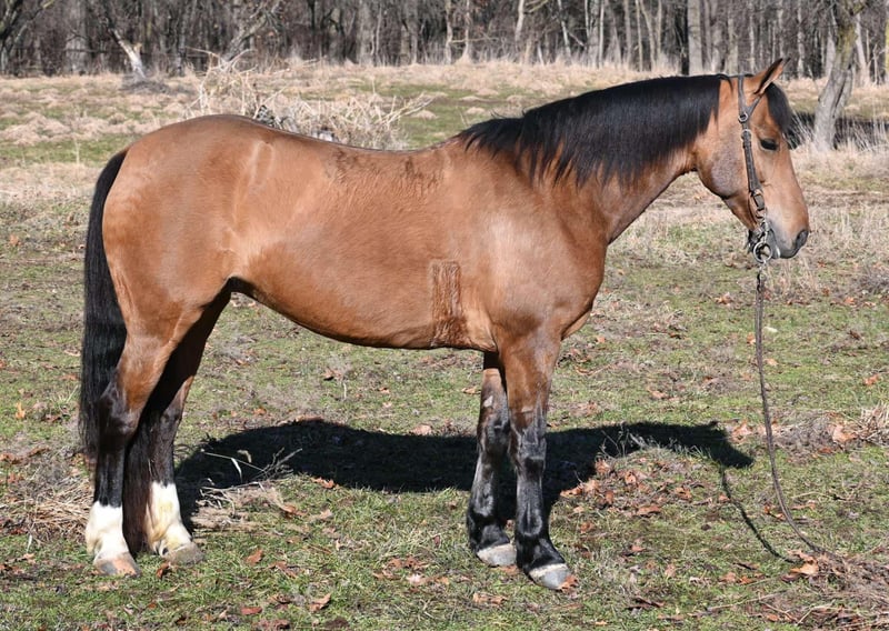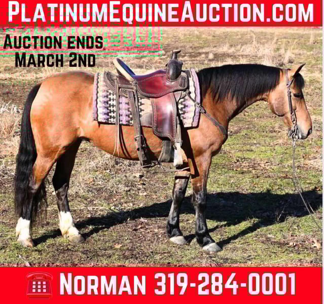 ONLINE AUCTION Place your bids at www.PlatinumEquineAuction.com Starting Bid $3500 Auction ends March 2nd, 2025 Need a new saddle? Check out White Rock Saddles on our website or Facebook! Beauty is a 13.2H, 8 year old, Buckskin/Dun Quarter Horse/Pony. She is stout built and is a handy size for everyone to ride. She is broke to ride english, western, bareback and drive single or double. She will go anywhere you ask her to go. She has been through town, down the highways, miles of trails, creeks, ditches, logs… she does it all! Beauty is easy to catch, saddle, bridle, shoe and bathe. She gets along great in the pasture and has no stall issues. She will walk, trot, canter, takes the correct leads and lopes nice circles. If you are a smaller adult or have kids who need a good horse, Beauty is the perfect choice! She is up to date on all and sells sound. For more info contact Silver Star Stables Norman 319-284-0001 with any questions. Located in Sturgis, MI. ONLINE AUCTION Place your bids at www.PlatinumEquineAuction.com Starting Bid $3500 Auction ends March 2nd, 2025 Need a new saddle? Check out White Rock Saddles on our website or Facebook!