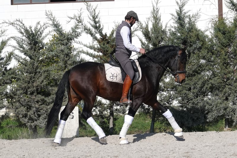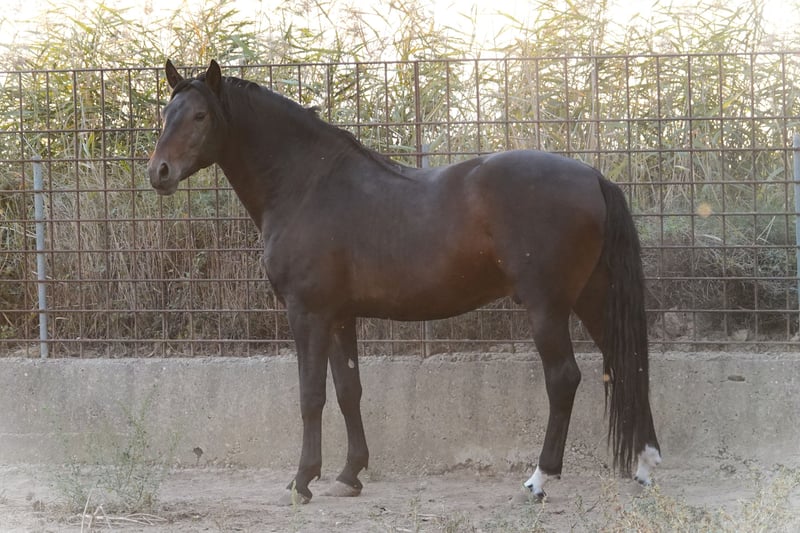 4 years old. 75% PSLusitano — Alter Real bloodline — and 25% German Warmblood (Donnerhall). Dark bay. Approximately 160 cm. Born and bred in northern Spain.