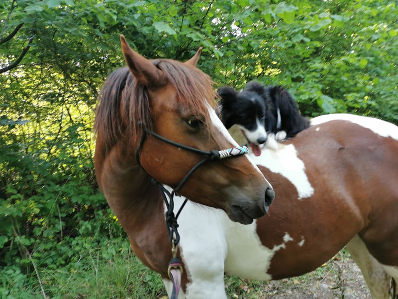 Geboren am 25.05.2019. Farbe: Tobiano Schecke, Alzane. Stockmaß: 125 cm am Widerrist. ONCP Maïka ist eine menschenbezogene Stute, die im Horsemanship (Ethologie) nach Johan Hofmans ausgebildet wurde. Sie ist eine sehr gute Wanderratte, reitet alleine und ist überall zuhause. Sie ist an Hunde gewöhnt. Charmant und angenehm zu reiten, da sie sehr fein auf die Hilfen reagiert. Sie könnte auch für einen Reiter geeignet sein, der Freude an Turnieren hat. Im Dressurtraining ist sie noch grün.