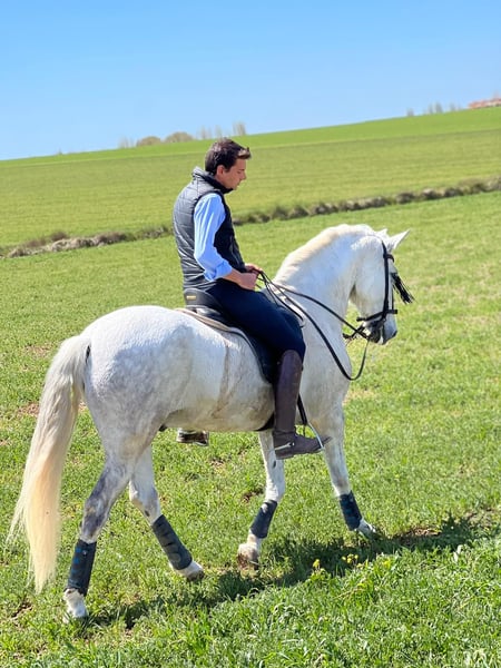 Cacique Pure Spanish horse with normal passport Height measured with hypometer 1,63m. Large Tordo Born in April 2009 Gelding Ideal for the track and the field He has been in numerous events of all kinds (competitions, shows, romerias, fairs). Good movements Very tame and with a great rideability. Leg yields, back in, travers, renvers, support, foot changes, pirouettes, Spanish walk. Any questions call 696613777