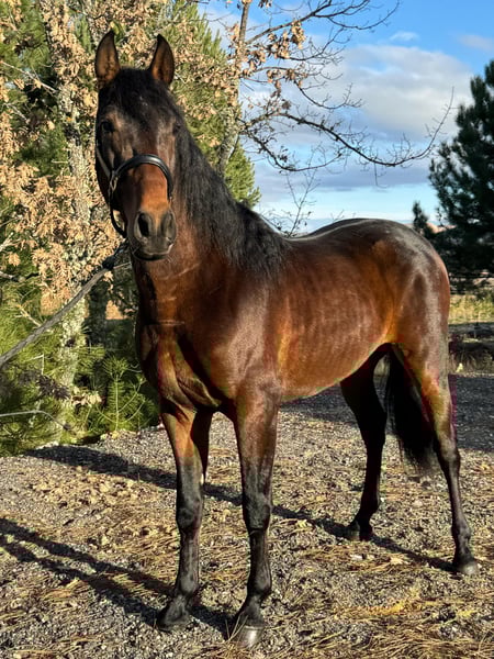 This young PRE stallion, born in January 2023, combines a compact, baroque type with expressive movements and a curious, intelligent character. He is already backed and easy to handle, a promising young horse with charisma, quality, and great potential for the future.